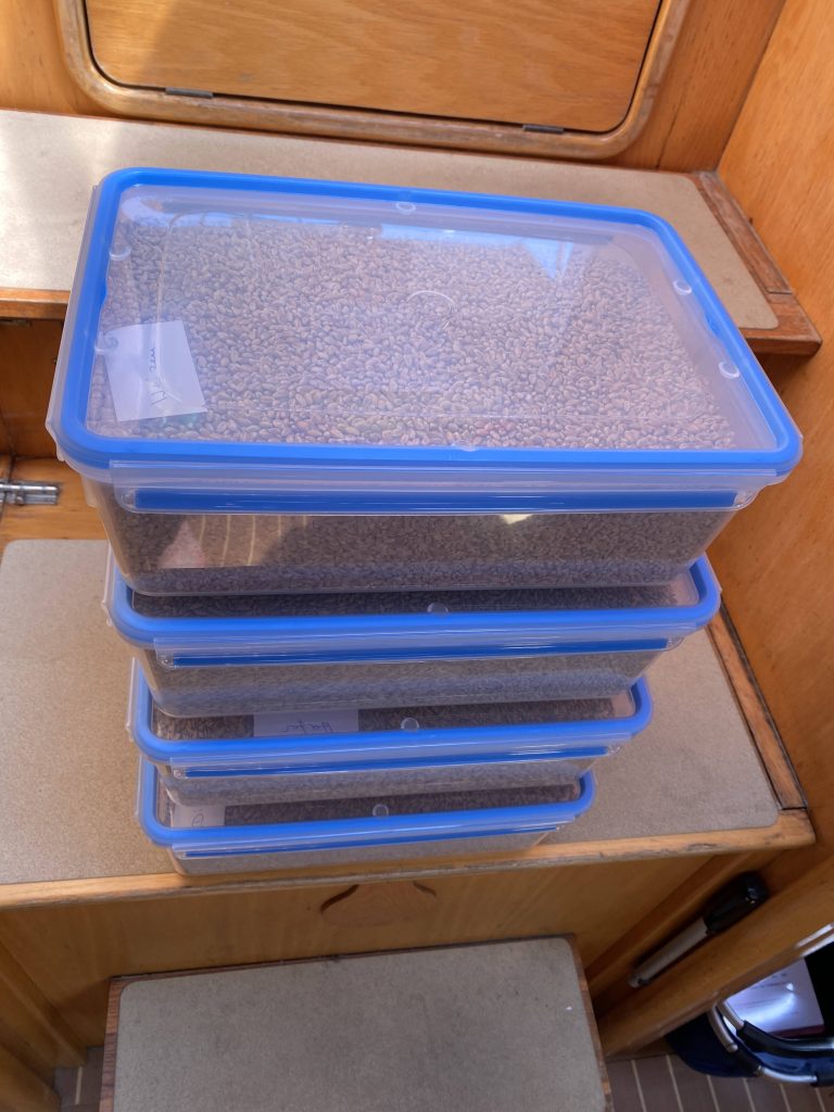 Auch da ist viel Planung und manche Organisation nötig. Wieviel Getreide braucht man in einem halben Jahr? Wie beschafft man es. Hier war es einfach: Jan Alberts von der Sundwiger Mühle in Hemer, der wie wir am Hegenscheid im LSV fliegt, suchte noch einen alten Fallschirm und wir Getreide. Das passte gut zum