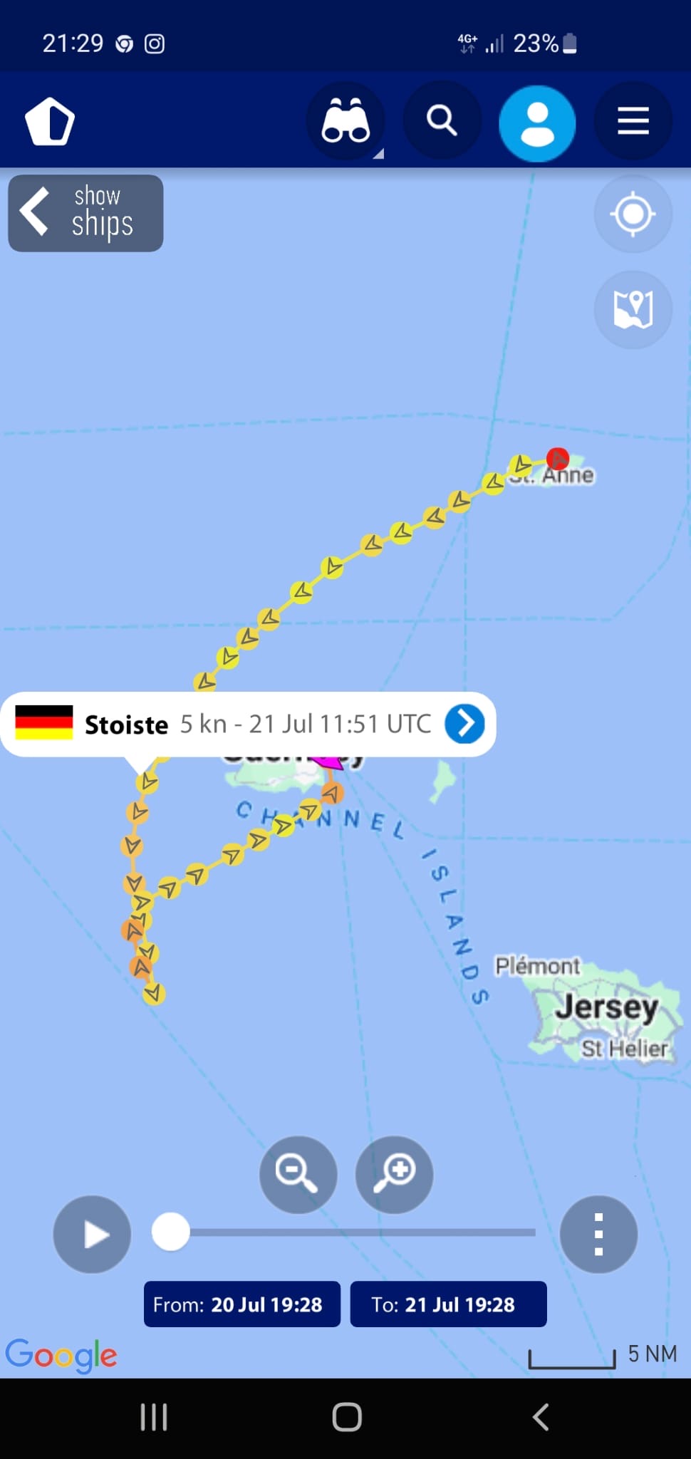 An der Insel vorbei nehmen Wind und Welle zu, wir sind schnell unterwegs, laufen jedoch zu weit nach Süden. Um nicht vor der Küste Frankreichs mit Wind gegenan hängen zu bleiben, ändern wir unseren Kurs und versuchen Höhe zu laufen. Der Wind und die Strömung lassen die geplante Richtung nicht zu, gegen Strom und Wind geht es nicht. Wir haben nur die Möglichkeit zurückzusegeln. Das war so nicht geplant, aber so isses nun mal. Mittlerweile haben wir 35kt Wind und 5m Welle, die Bedingungen könnten schöner sein. Etmal 38,4sm und keine Meile in die gewünschte Richtung. Der Tag hat uns gefordert, wir ankern vor Guernsey.
