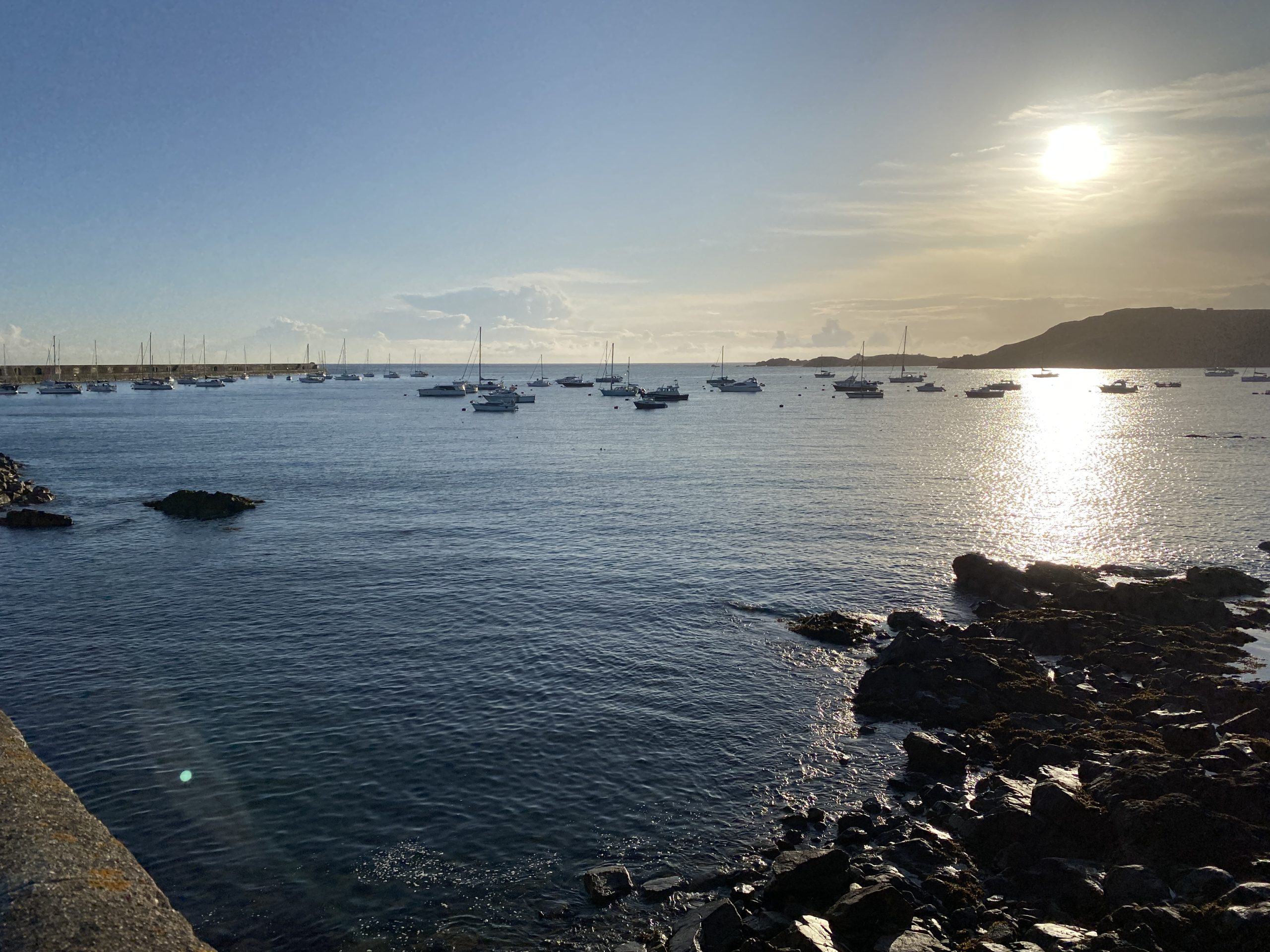 Von Alderney an begrüßt uns die Atlantikwelle. So deutlich war sie bei der Einfahrt noch nicht zu spüren, jetzt ist sie langgezogen und höher und trägt uns gut. Es ist ein klein wenig Champagnersegeln, Wind von passender Richtung und Stärke und die Sonne kommt auch raus.