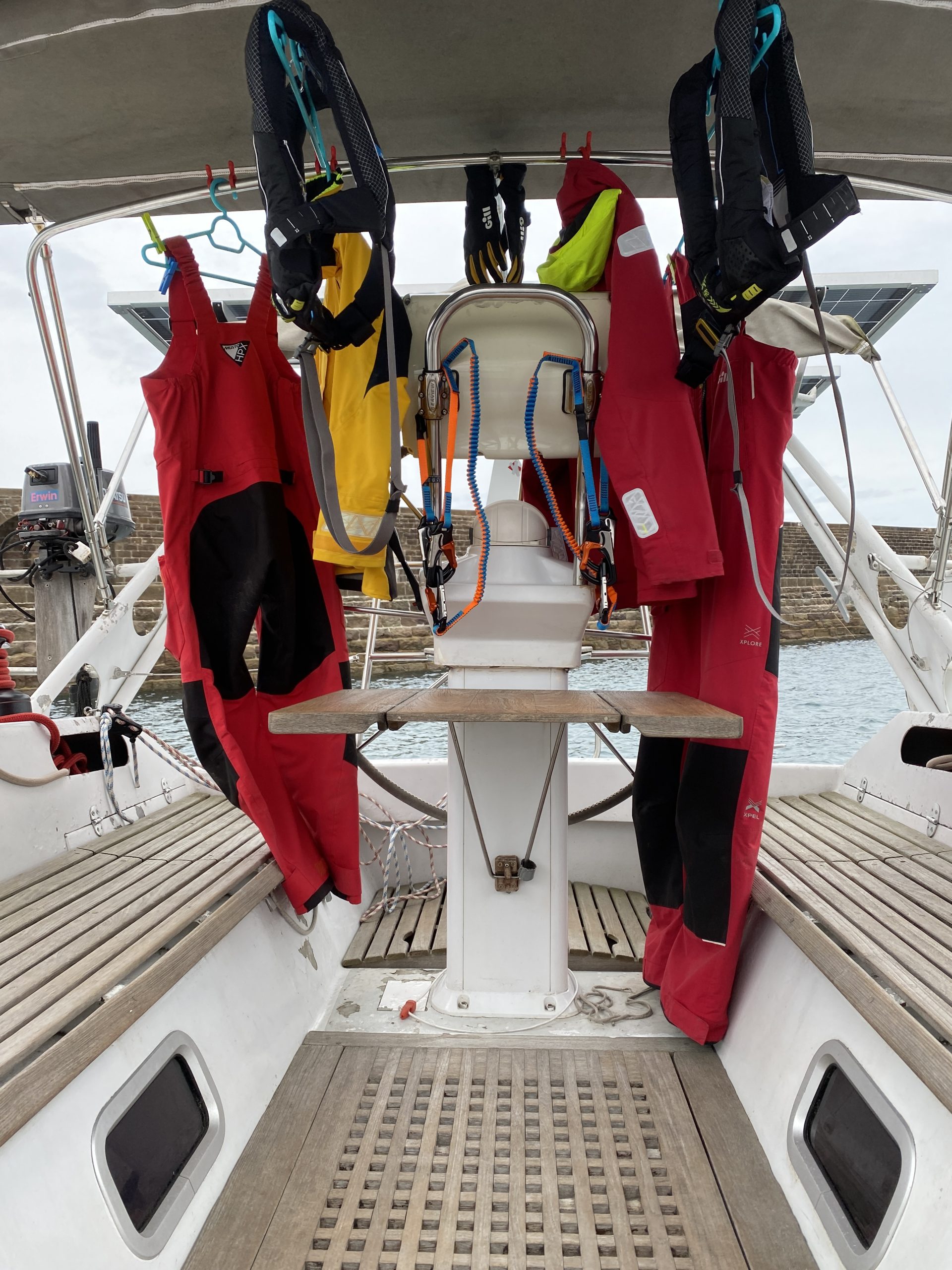 Vor der Hafenmauer von Alderney liegen wir an der Mooring und können unsere Sachen zum Trocknen aufhängen.