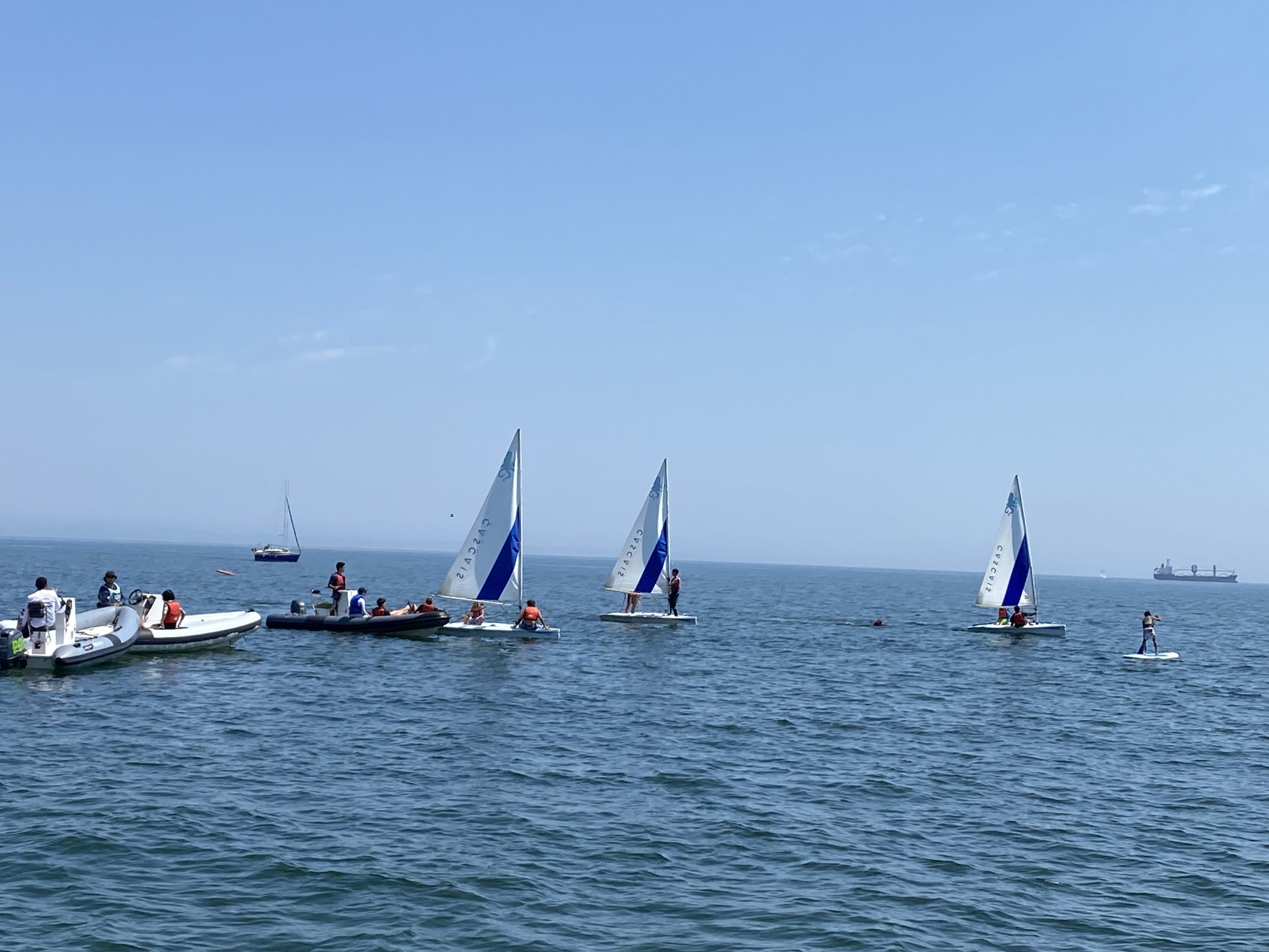 Danach startet ein Unterhaltungsprogramm der besonderen Art. Der ortsansässige Segelclub hat Ferienprogramm, es sind bestimmt 80 Kinder mit einer bunten Bootsauswahl in der Bucht unterwegs. Jede Menge Optis, Laser, SUP und Jollen segeln um uns herum, üben die Boote nach dem Kentern aufzurichten und haben sichtlich Spaß. Ein Junge begrüßt uns auf deutsch und ruft uns stolz zu, dass er unsere Sprache spreche.