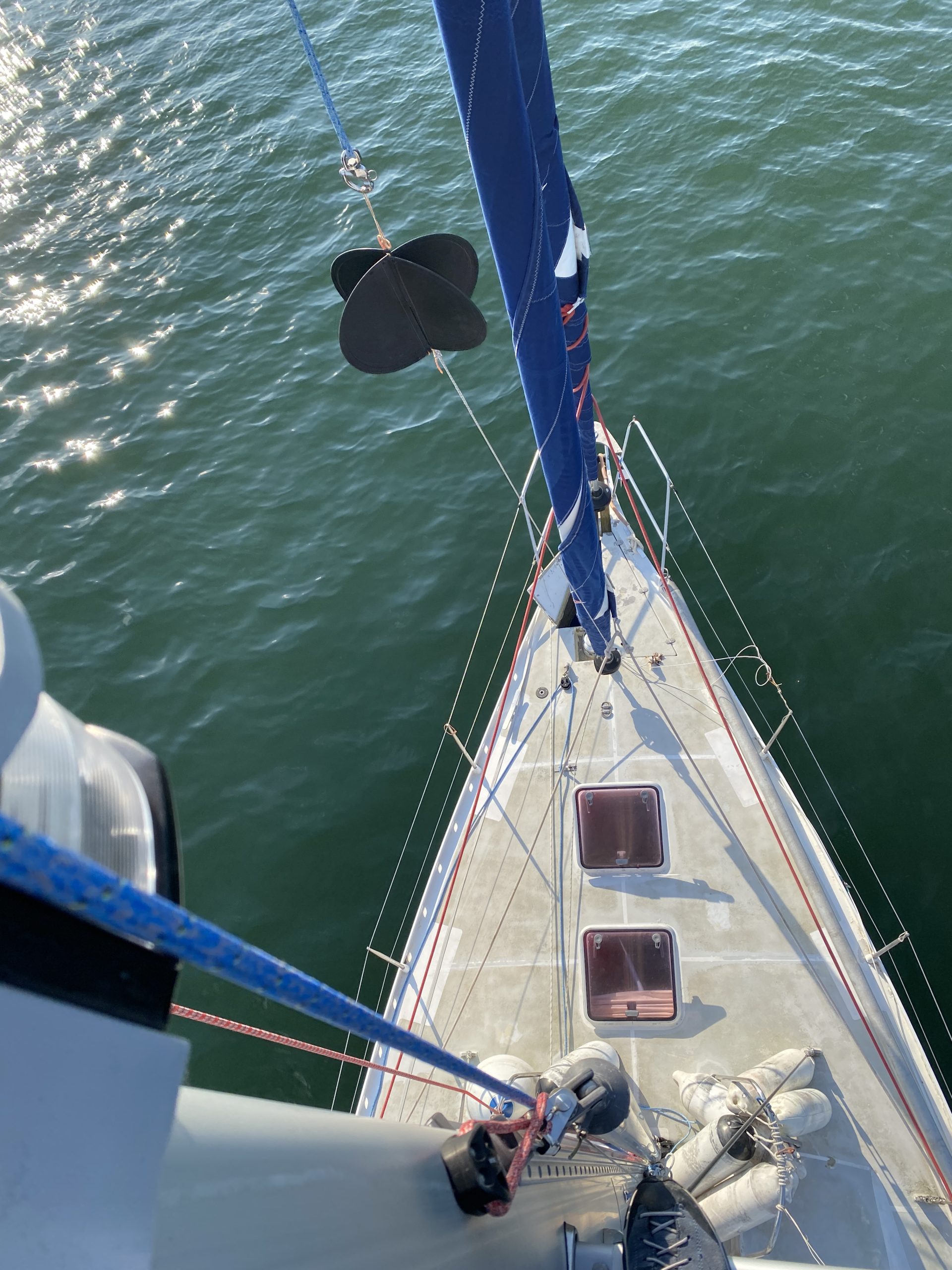 Ich gehe in den Masten um das Großfall, das sich um das Radar gewickelt hat, zu klarieren. Dazu nutzen wir einen Klettergurt, da wir in guten 16m luftiger Höhe doch gerne gesichert sein wollen. Die Höhe bietet immer wieder einen schönen Rundumblick.