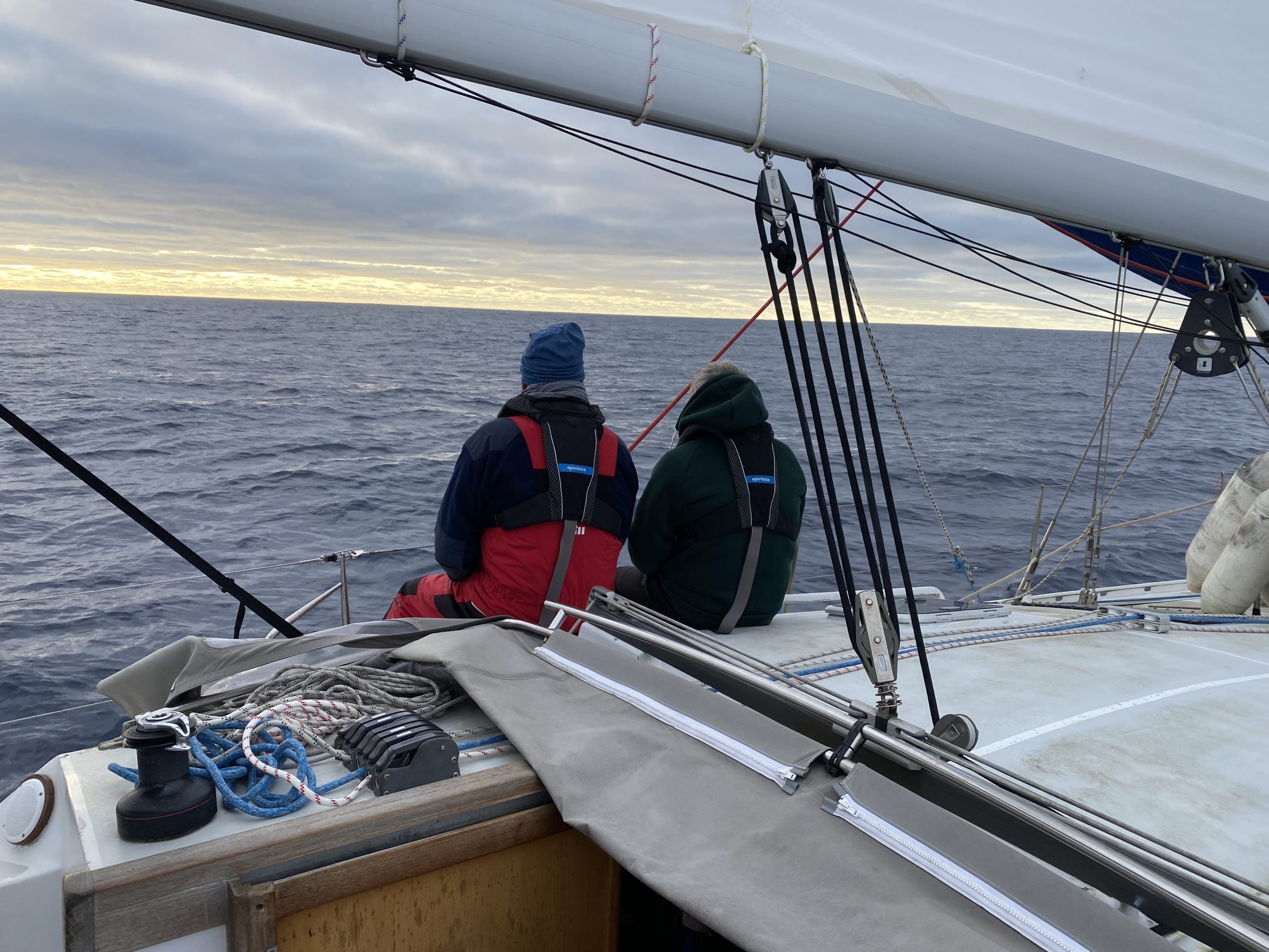 Wir kommen gut voran, meist jedoch abseits unserer Kurslinie. Wind und Welle stehen halt nicht immer einwandfrei passend. Da die Strecken umfassender sind, kommt es letztlich trotzdem gut aus. Wir sehen vereinzelt Frachter in weiterer Entfernung, ansonsten Meer und Himmel.