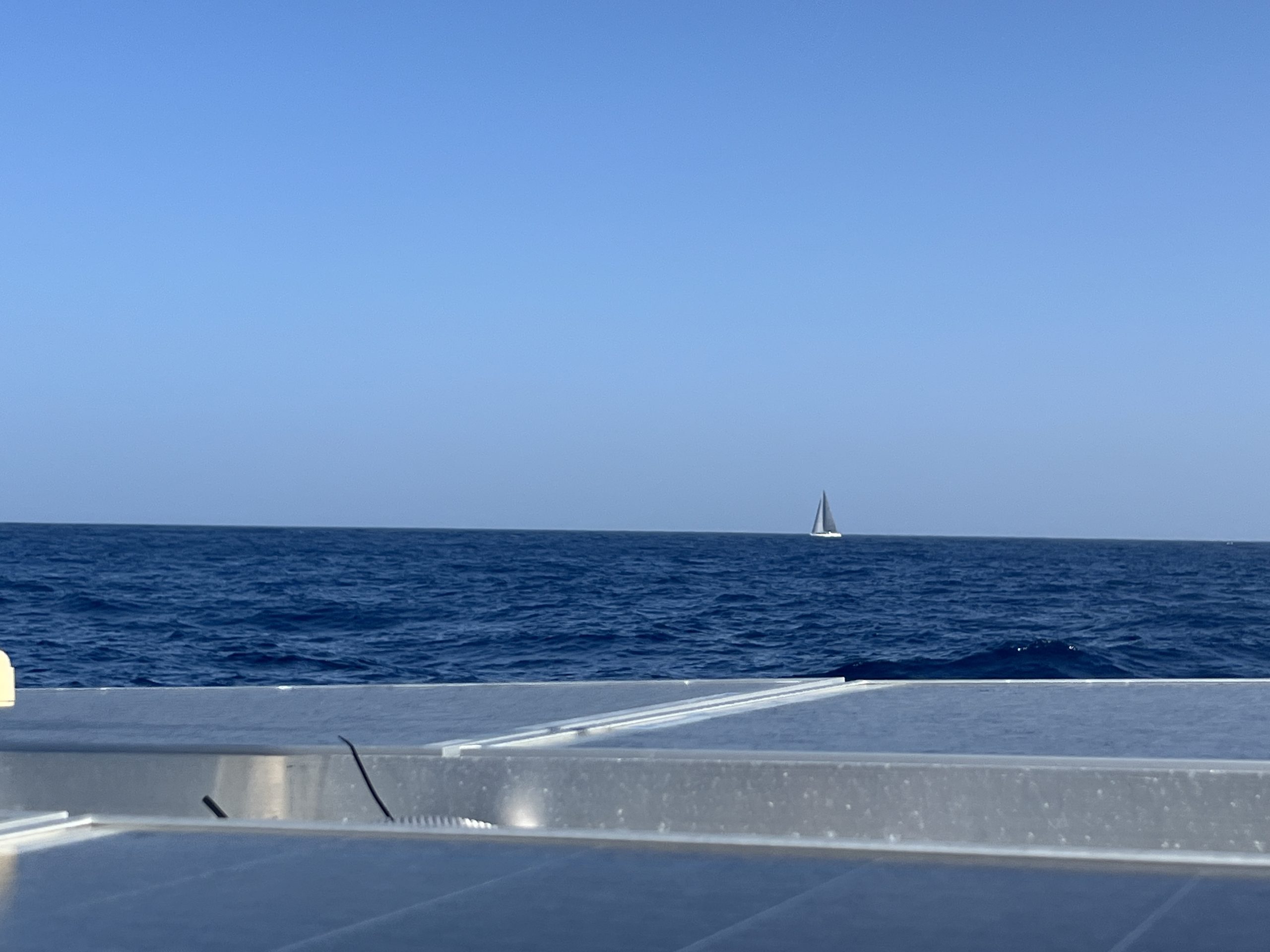 Zum ersten Mal seit der Abfahrt vor über einer Woche sehen wir ein anderes Segelschiff. Die Sunyo, eine große 27m Segelyacht, die unter Segeln auch recht langsam auf dem Weg nach Saint Peter auf Antigua ist. Der Skipper ruft uns über Funk und für ihn sind wir auch das erste Segelboot seit er Las Palmas auf Gran Canaria verlassen hat. Es ist eine niegelnagelneue Superyacht, die für den lächerlichen Betrag von USD 65.000 pro Woche zzgl. Nebenkosten zu chartern ist.