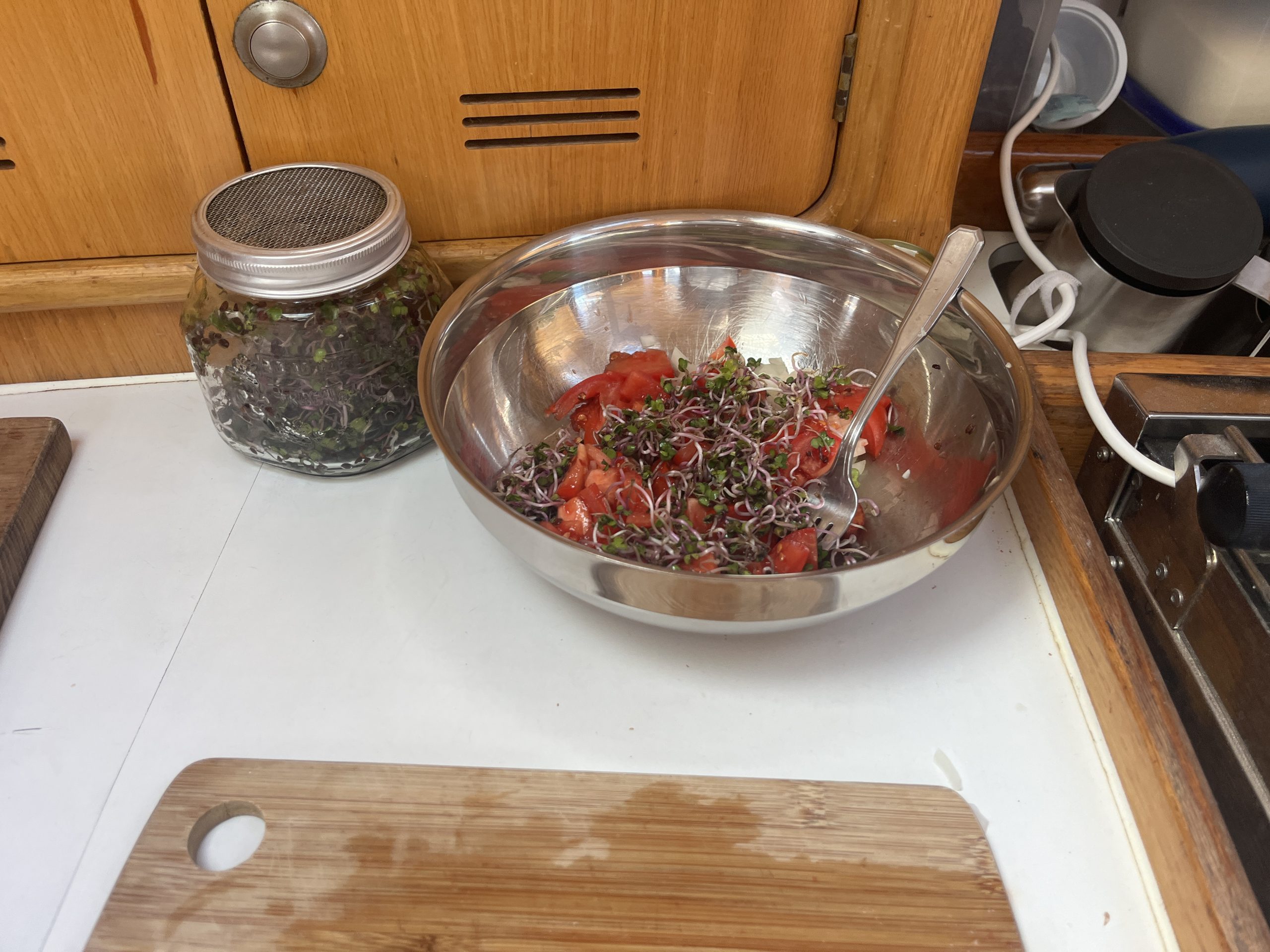 Da wir nicht Juliette, die Köchin der Sunyo, an Bord haben, muss ich mir heute meinen Salat mit frischen Sprossen selber machen. Somit ist wieder der Skorbut vorgebeugt. Kai isst derweil Nudeln mit Pfifferlings-Ragout, welches ich vor unserer Abreise eingekocht habe.