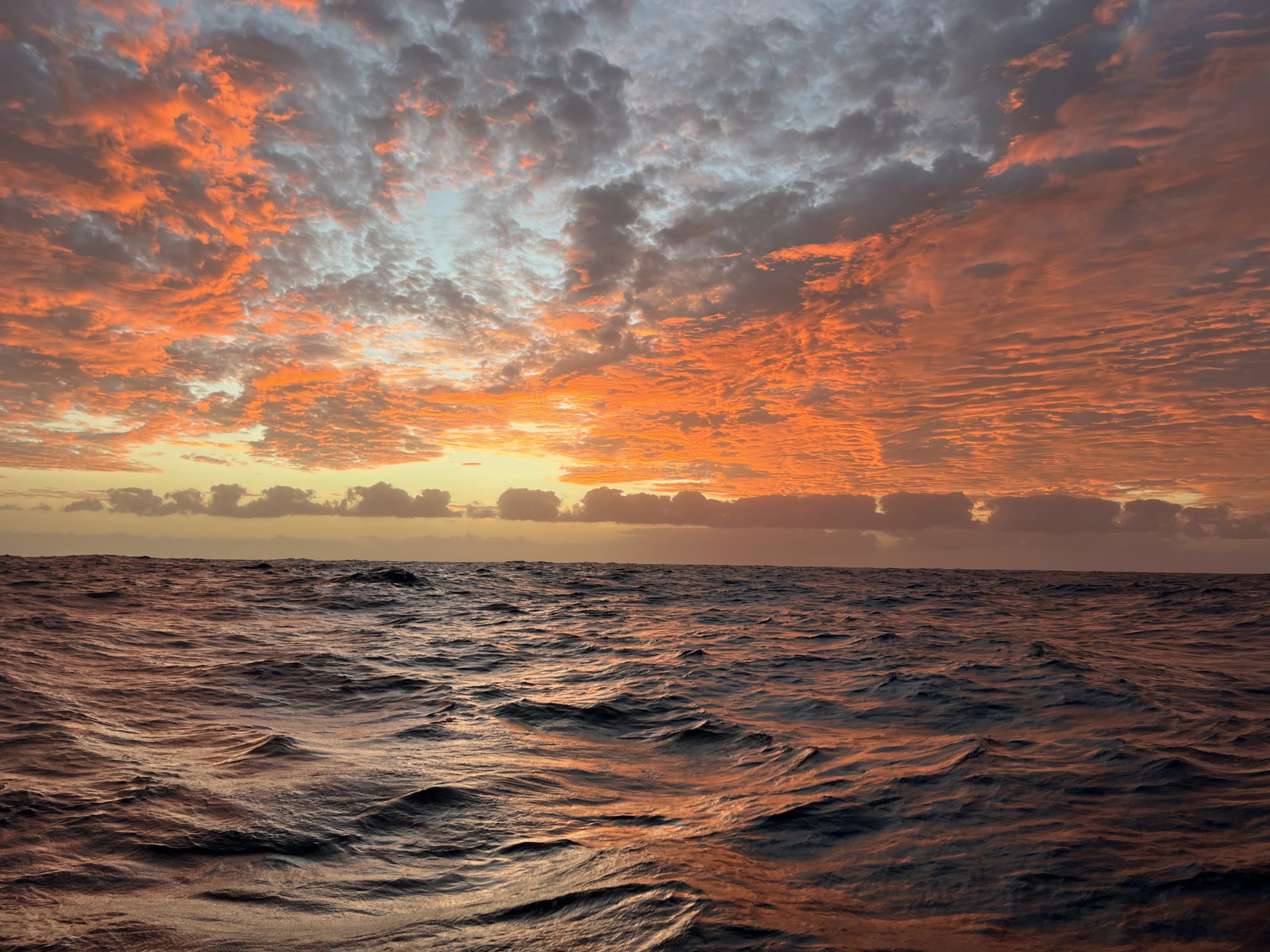 Tja, womit sollen wir anfangen? Am Besten mit der harten Wahrheit. Segeln ist nicht immer nur Vergnügen. Die letzte Nacht war sicherlich eine der unangenehmsten auf der Reise. Hohe Wellen aus allen Richtungen, so dass das Schiff ständig rollte und das mit einer Heftigkeit, daß auch das was niet- und nagelfest vermutet war, durch das Boot flog. Dabei gab es alles zwischen 2kt und 38kt Wind. Aber was soll ich sagen. Es war am Morgen alles hinter uns und der Sonnenaufgang entschädigte umso mehr.