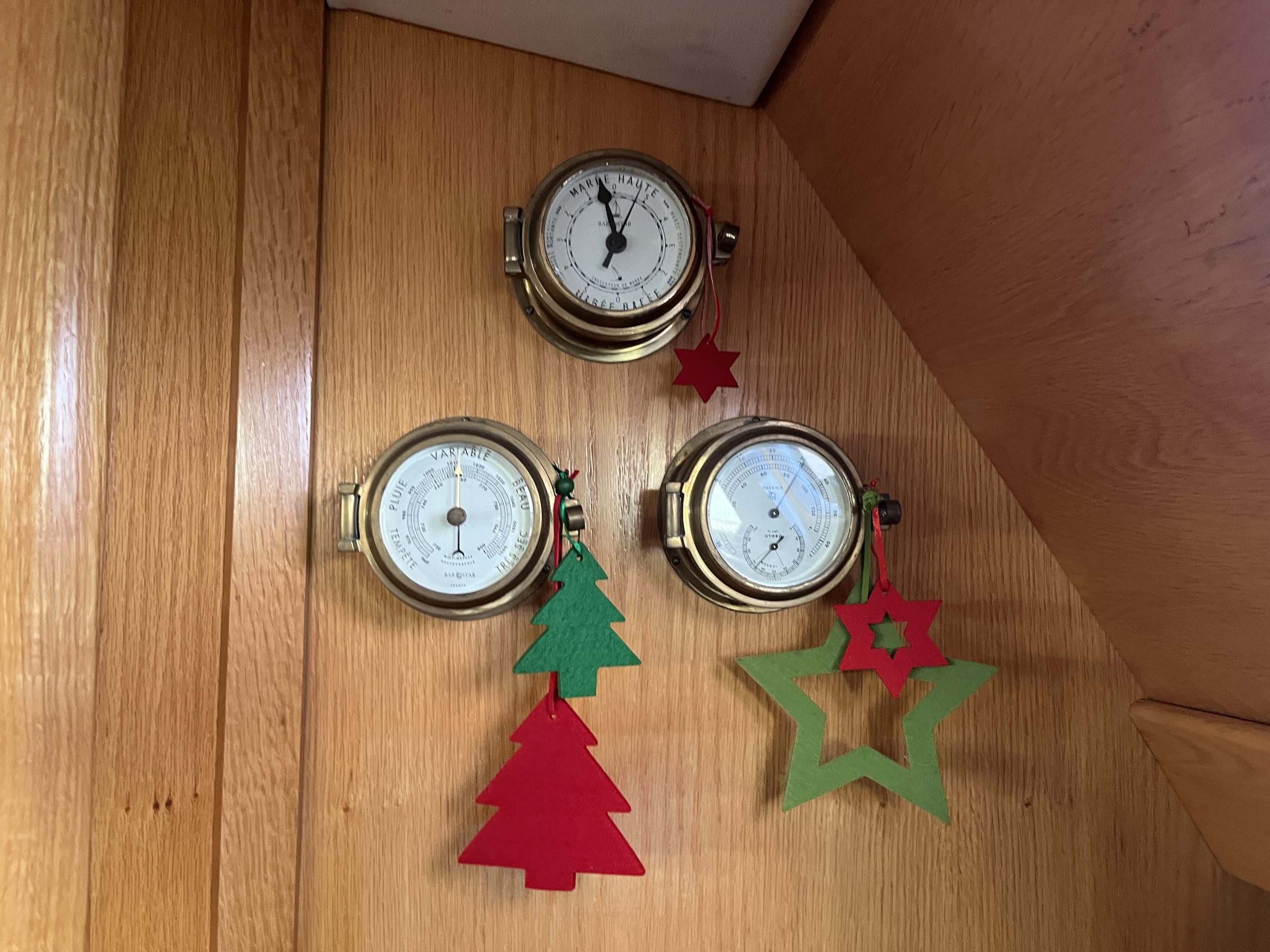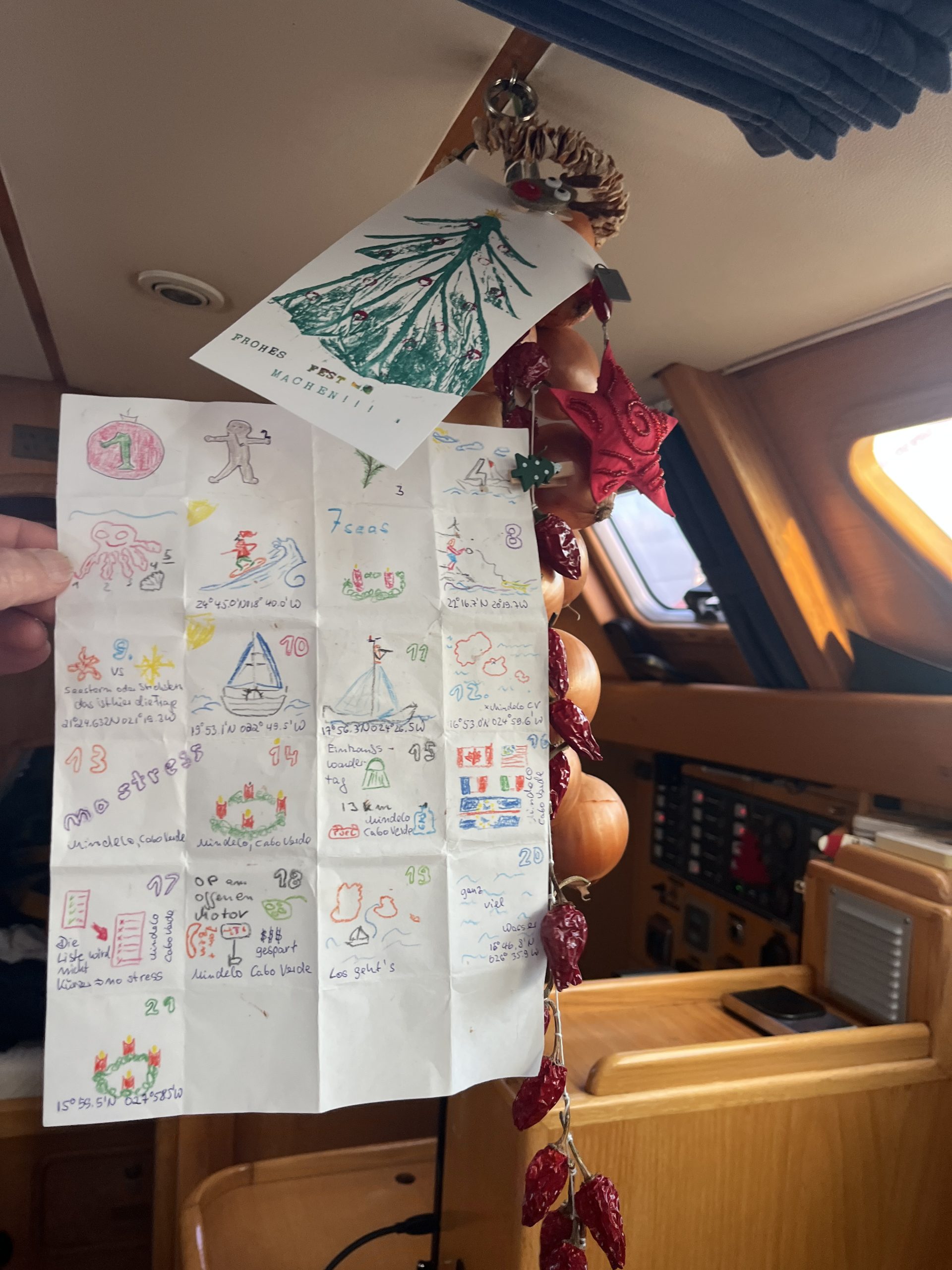 Ansonsten hat die Weihnachtsdeko auch Ihren Weg aufs Boot gefunden. Den täglichen Adventkalender habt Ihr ja immer im Beitragsbild und ich den Dominostein im Magen.