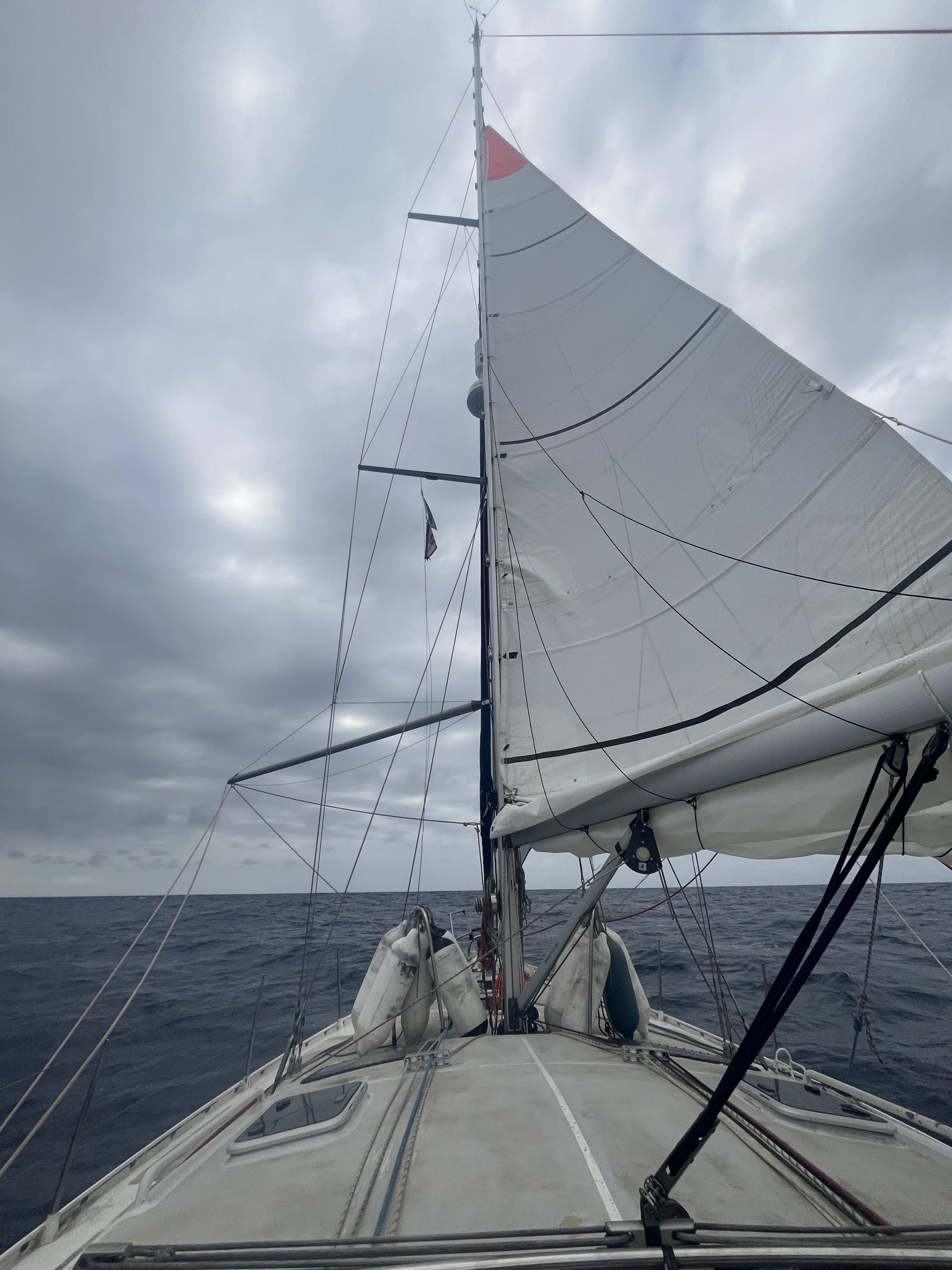 Der Tag beginnt mit einer Kursänderung. Wie schon vorher angekündigt, hat sich ein Flautengebiet in Richtung unserer direkten Kurslinie bewegt. Mit einem Schwenk nach Süden können wir diesem vermutlich ausweichen. Beim Segeln ist, wie bei vielem im Leben, nicht immer der direkte Weg auch der schnellste. Wir legen etwas extra Strecke zurück, sind aber mit einer höheren Geschwindigkeit unterwegs.