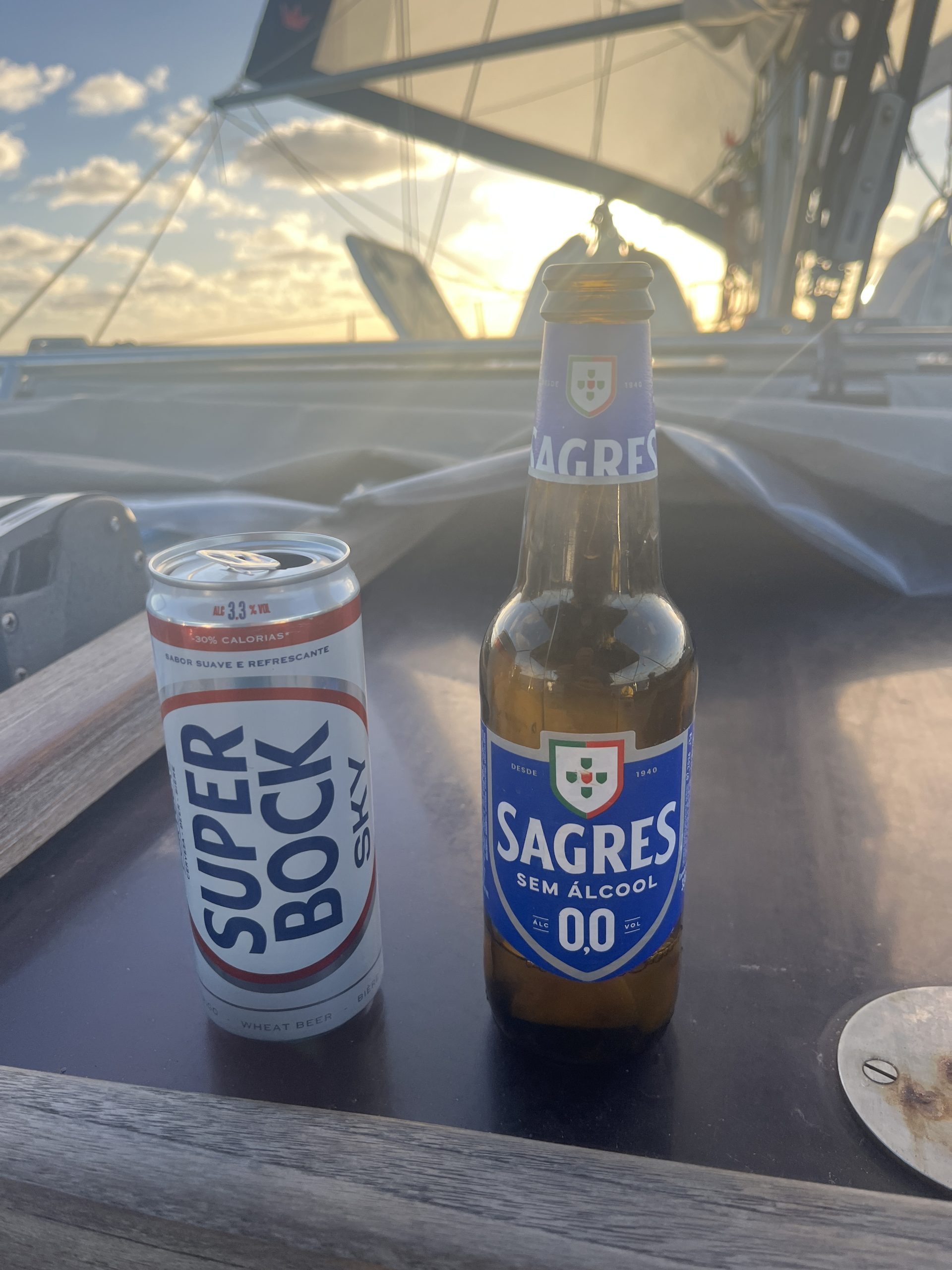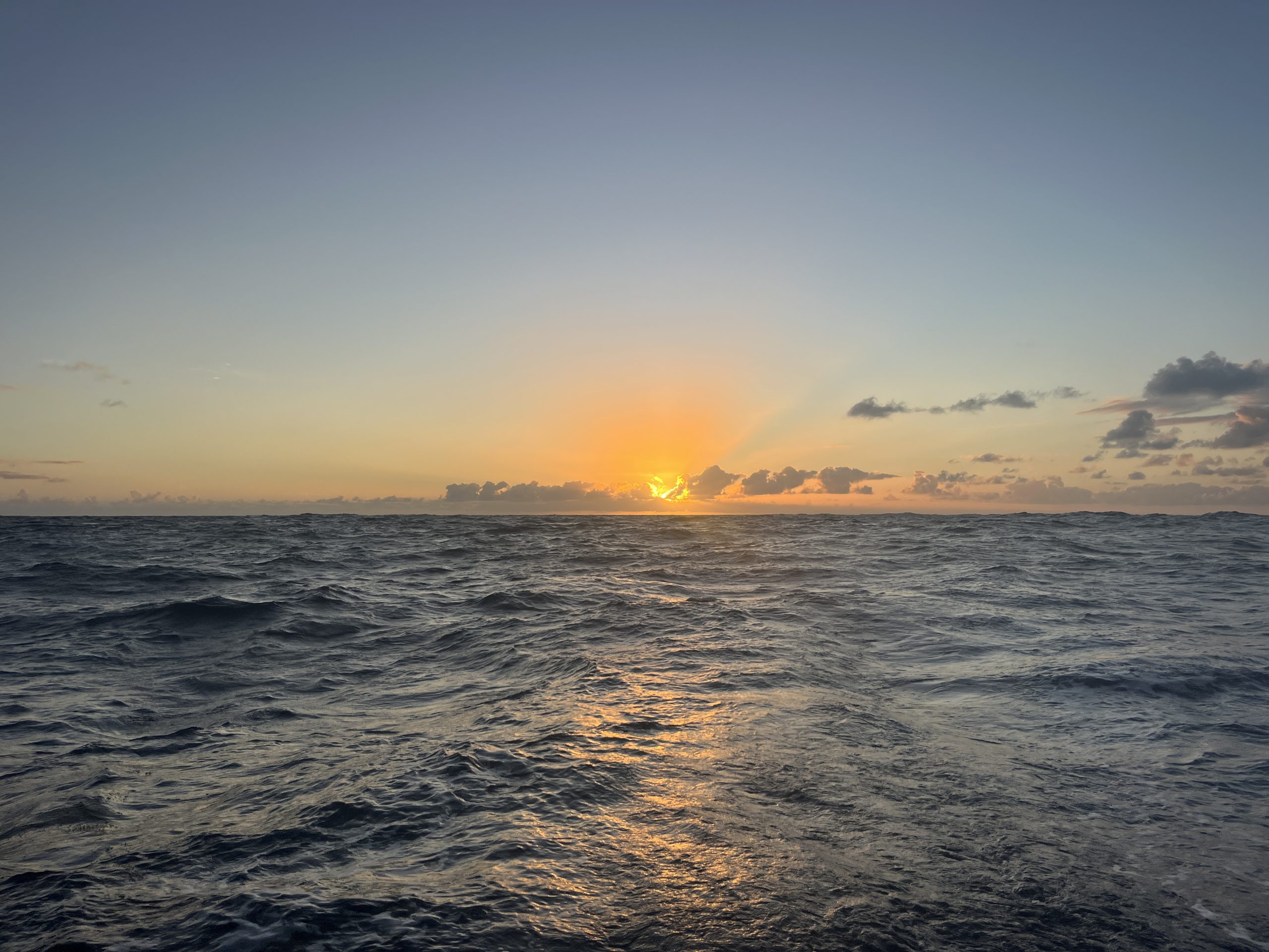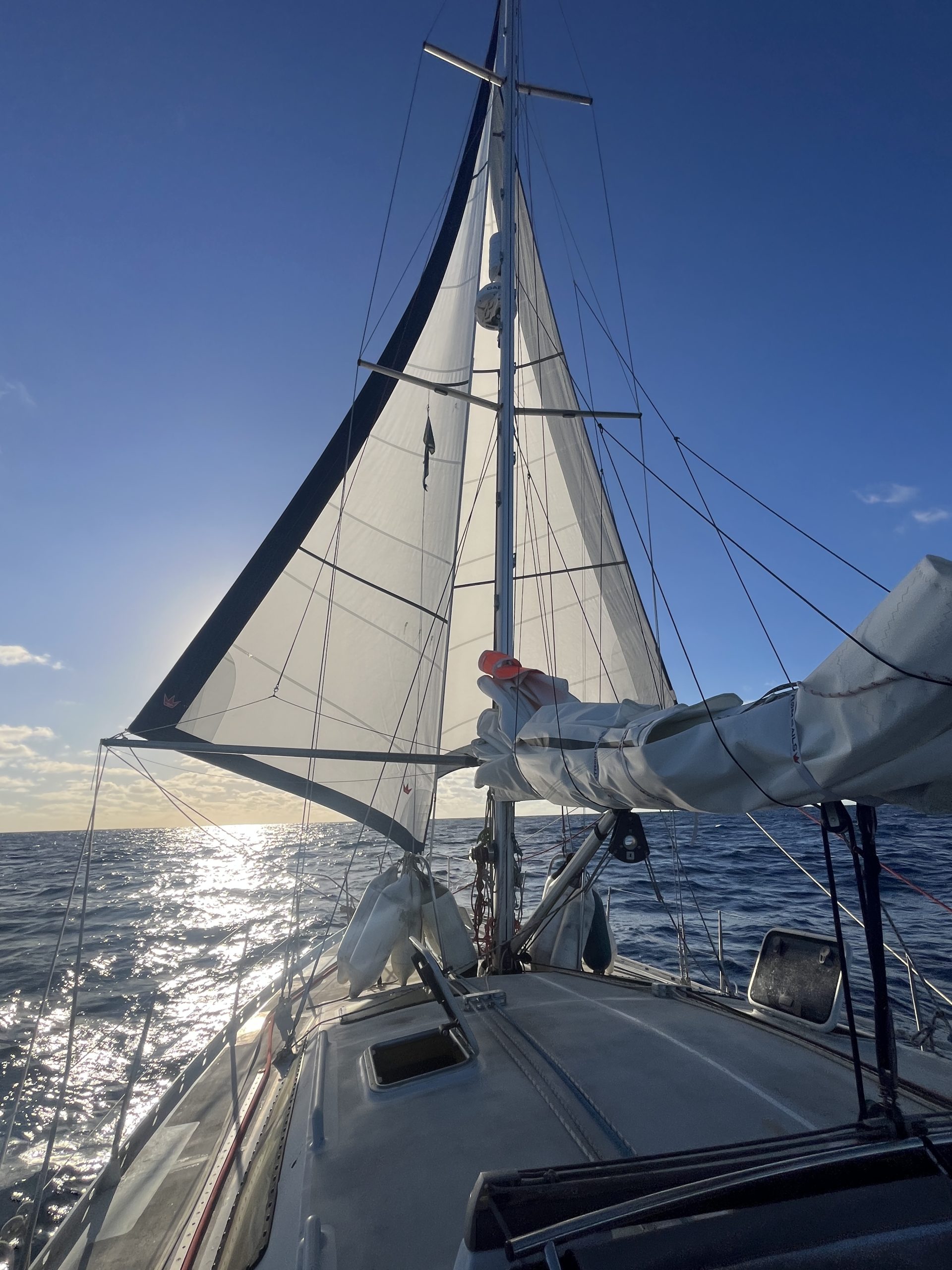 Naja, weil der Wind dann nachließ und die Segel nur noch in der Welle hin und her schlugen, haben wir kurz vor dem Sonnenuntergang doch noch einmal das Groß komplett runtergeholt und die Fock nach Backbord ausgebaumt.