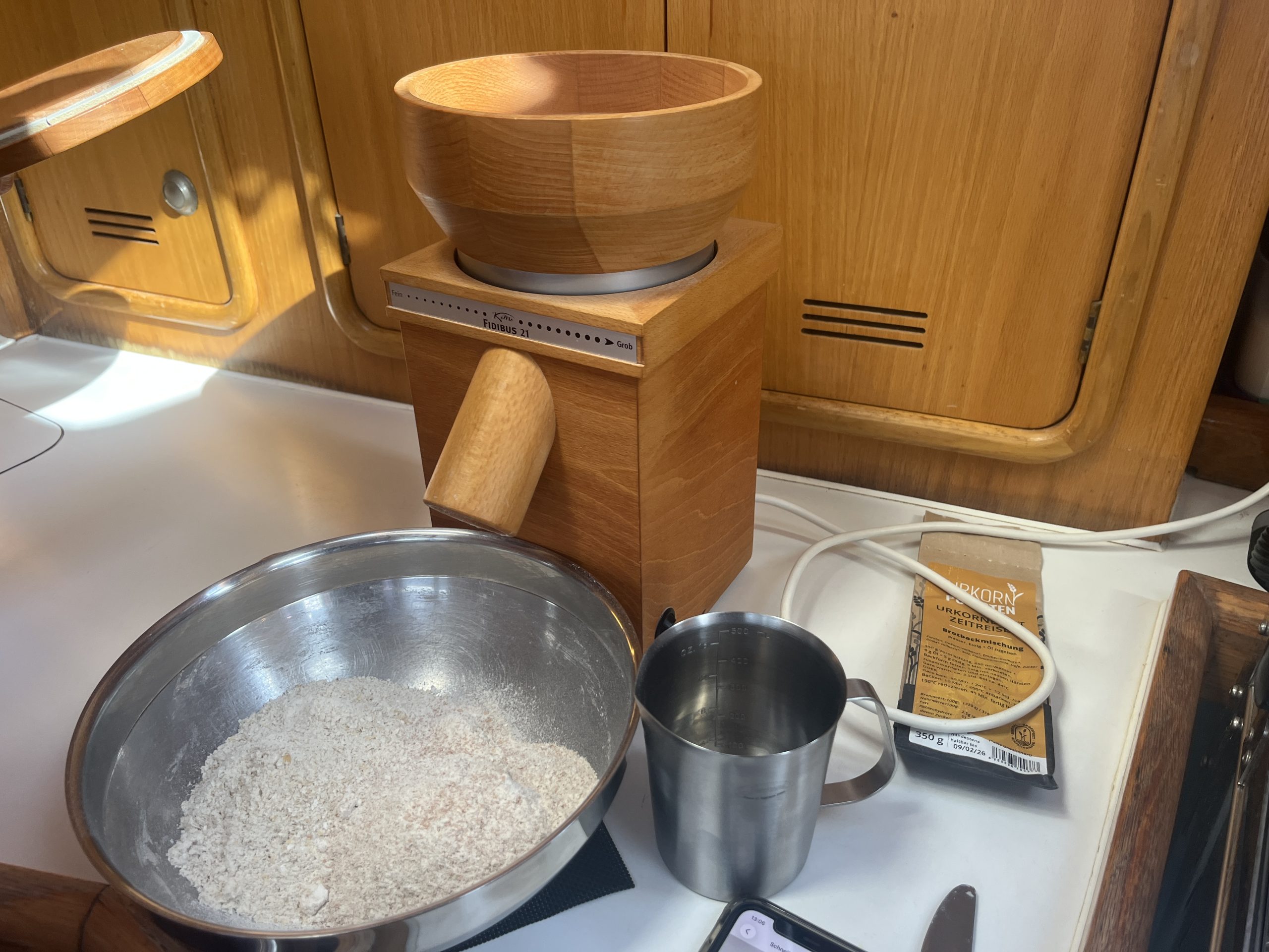 Aber da der Tag nicht nur mit Segelwechsel gefüllt werden kann, haben wir noch Brot gebacken und Hafer geflockt.