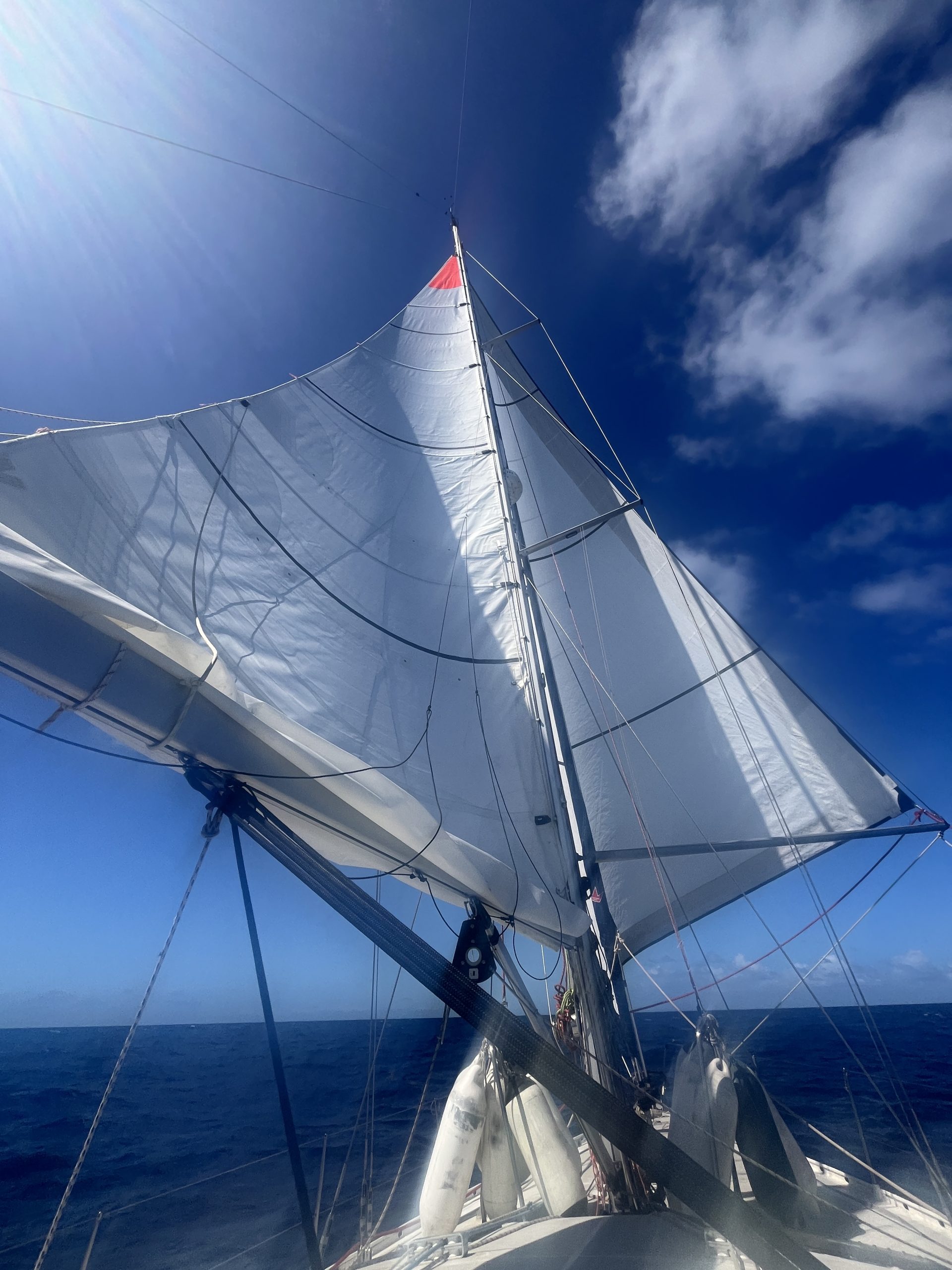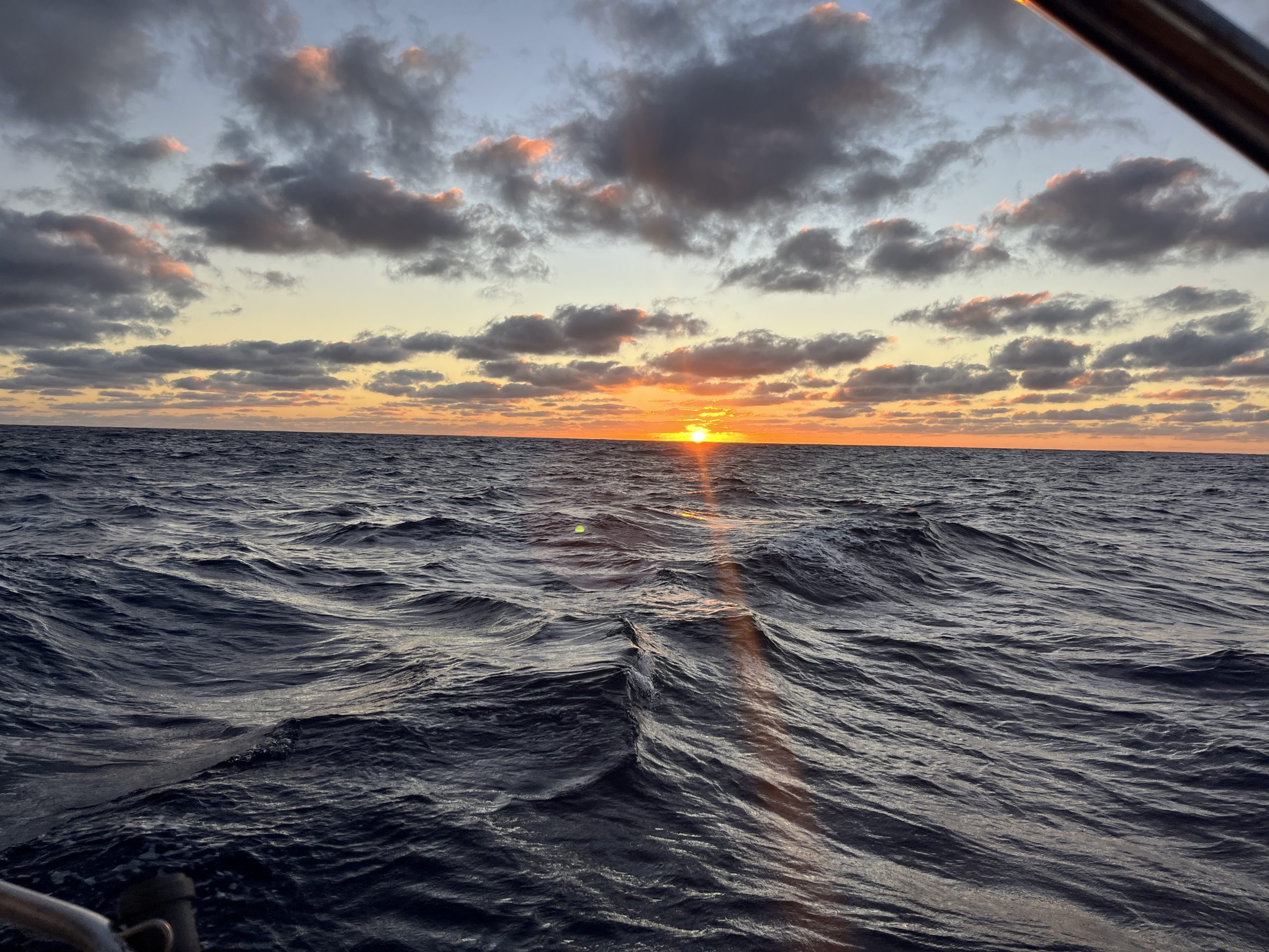 Gestern Abend haben wir wieder nach Nordwest gewendet und beide Segel (Yankee und Groß) auf die Backbordseite gestellt um dem verstärkt auftretenden Seegras des Südens zu entkommen. Naja, als es morgens hell wurde war im Norden noch viel mehr Seegras als im Süden, dafür hatte der Wind deutlich an Stärke abgenommen.