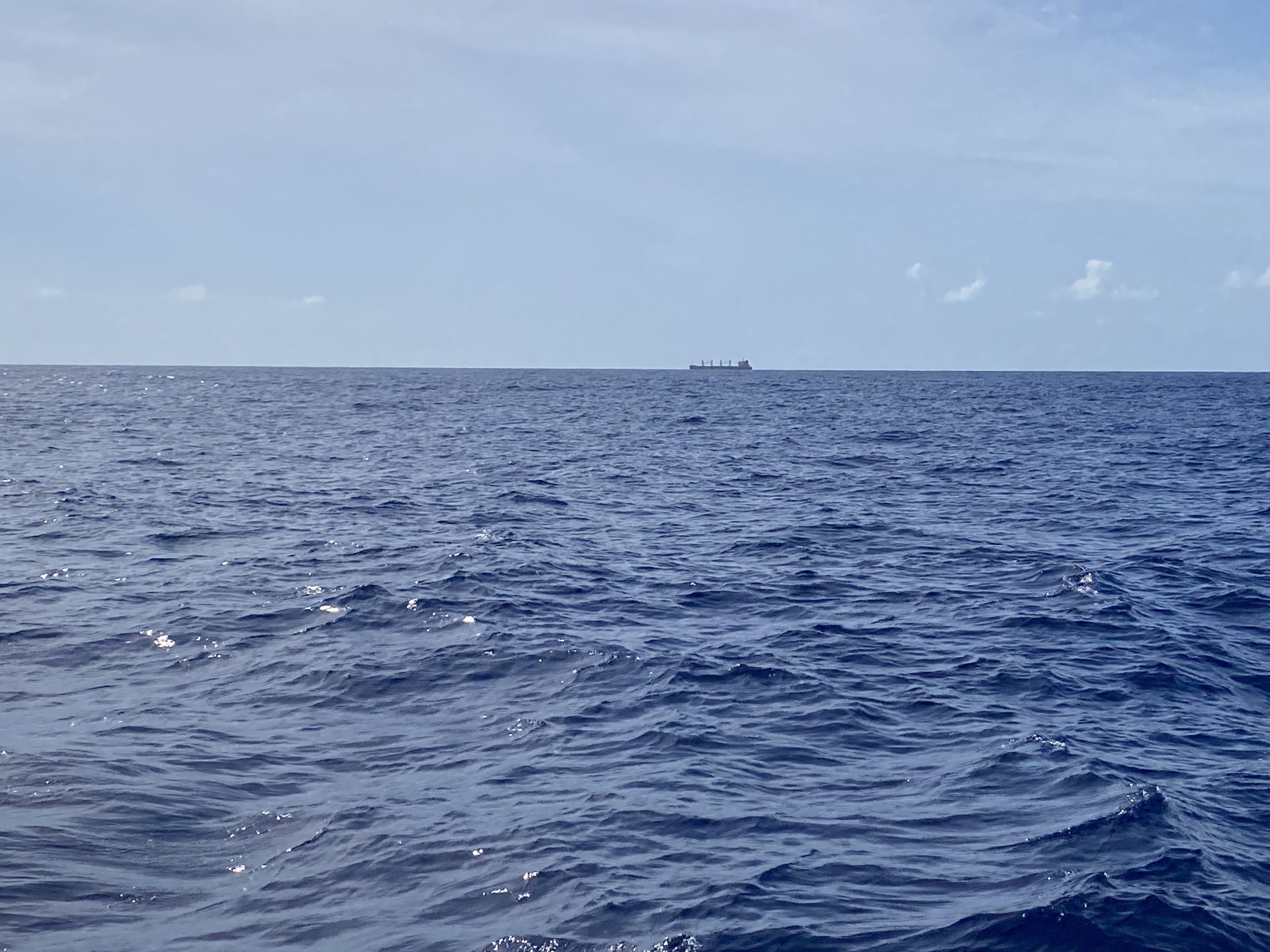 Kurz vor Sonnenuntergang passiert uns ein Frachter am Horizont in Richtung Osten. Mit 12nm Abstand können wir nur so gerade die Kranaufbauten sehen.