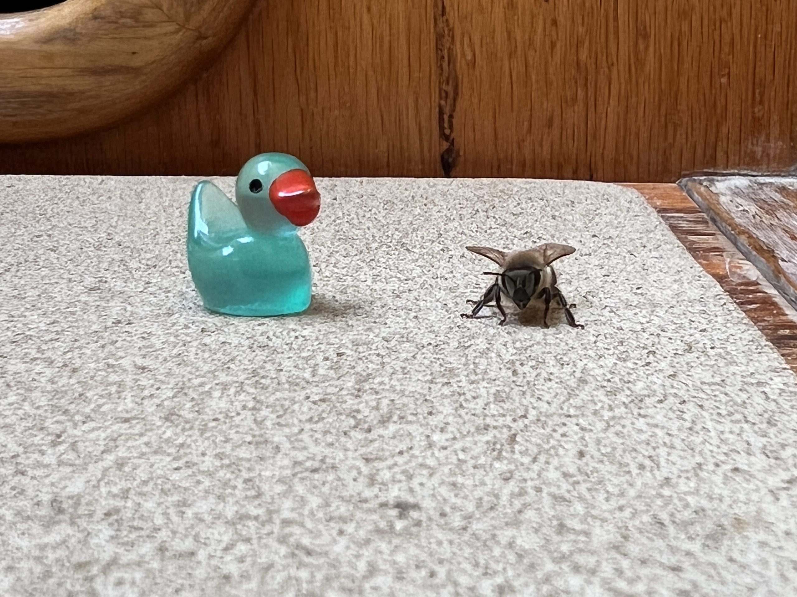 Gerade als wir darüber diskutieren, dass wir bisher keine Bienenstöcke gesehen haben, es im Supermarkt aber Honig zu kaufen gibt, landet eine Biene in unserem Niedergang. Die Biene ruht sich ein wenig aus und macht sich dann wieder auf den Weg. Wir wissen natürlich nicht ob sie eine wilde Biene ist, freuen uns jedoch sehr über ihren Besuch.