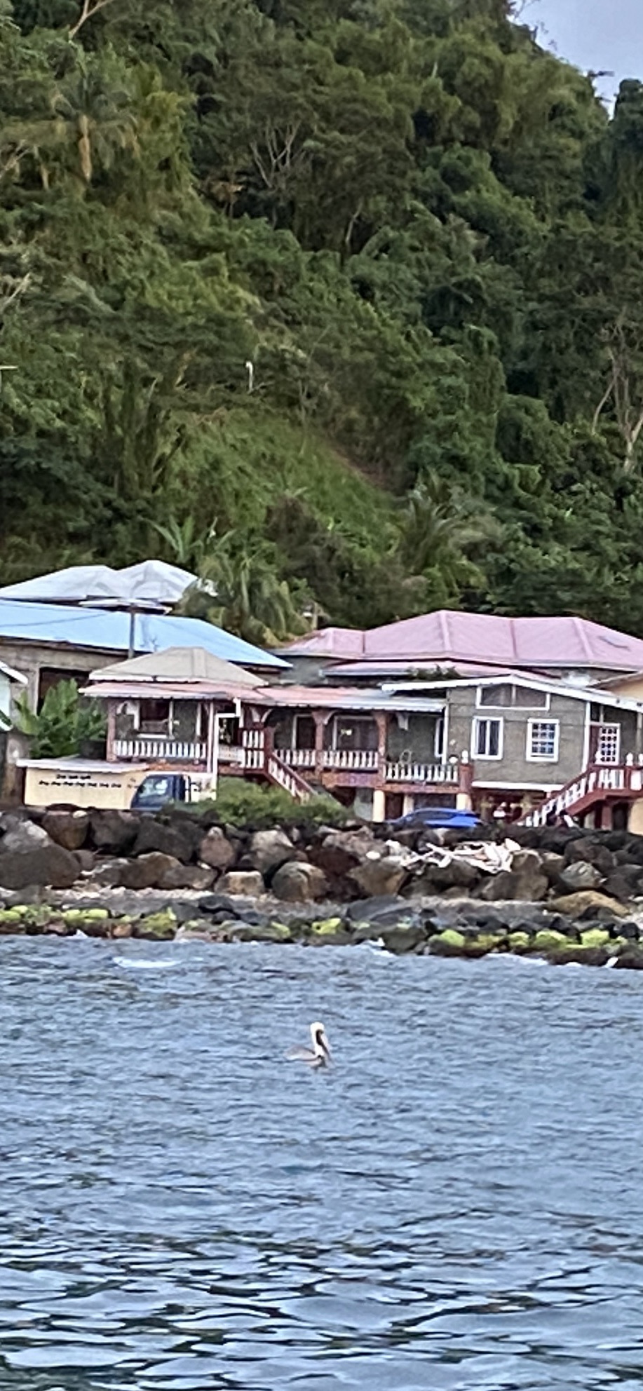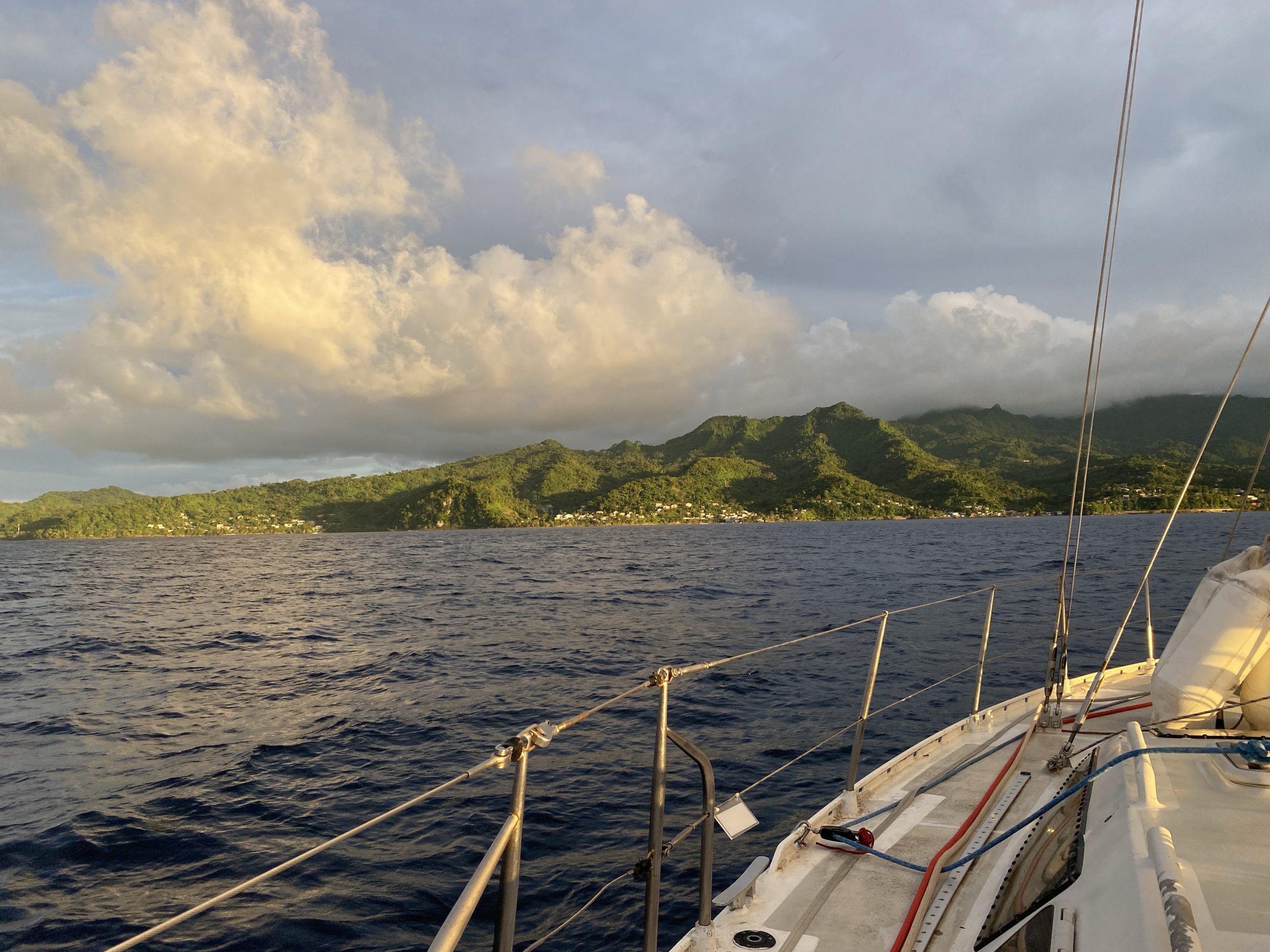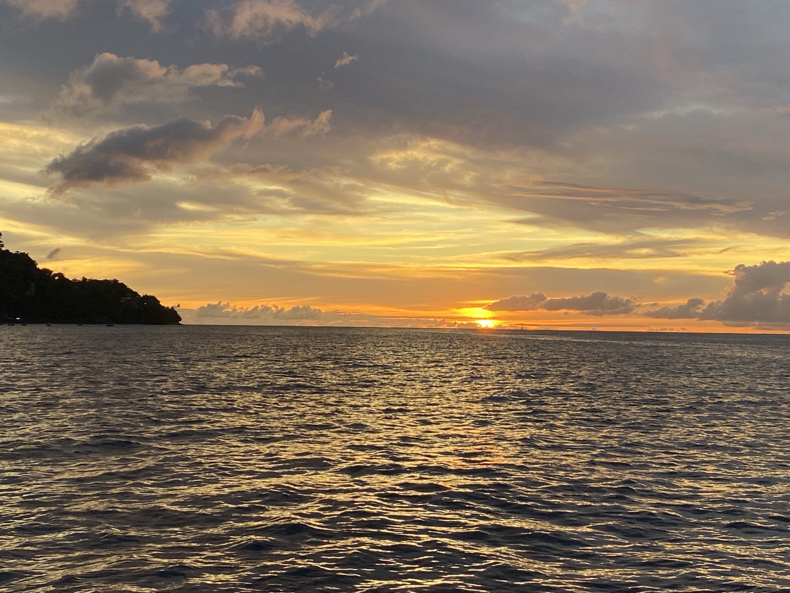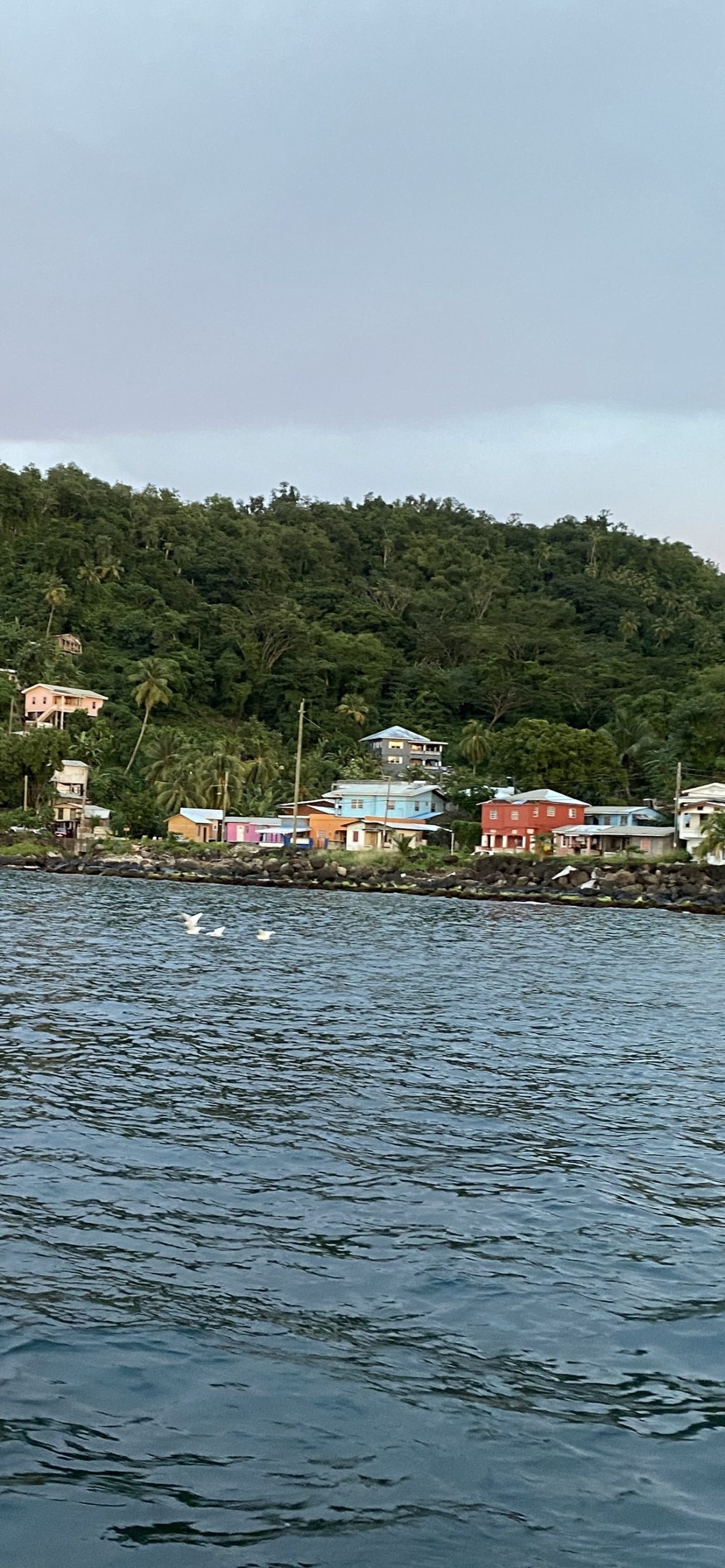 Die bunten Häuser, der ganze Bewuchs, so sieht es wohl in der Karibik aus. Heute trinken wir einen Campari-Orange als Sundowner und werden mit einem entsprechenden Sonnenuntergang in der Saint Mark Bay belohnt.