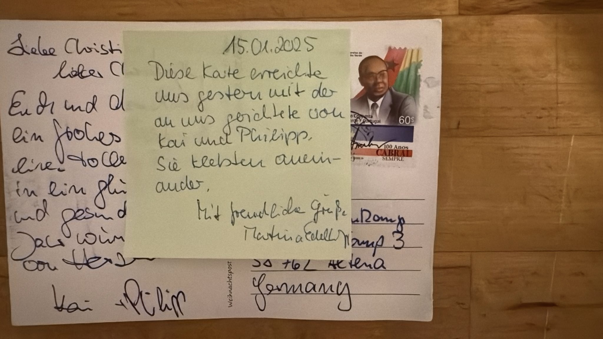 Unsere Weihnachtskarten befinden sich weiterhin in Zustellung. Viele sind mittlerweile angekommen, manche werden ihren Adressaten wohl nicht mehr erreichen. Ein Postsack scheint hinter dem Airmail-Flugzeug her geschwommen zu sein. Einige Karten sind nass geworden und dadurch beschädigt. Teile der Karten sind abgerissen, andere Karten sind miteinander verklebt. Eine Karte, die nach Altena adressiert war, ist auf diese Weise in Burgdorf gelandet und konnte glücklicherweise trotzdem noch zugestellt worden. Mal sehen welche Geschichten sich noch ergeben.