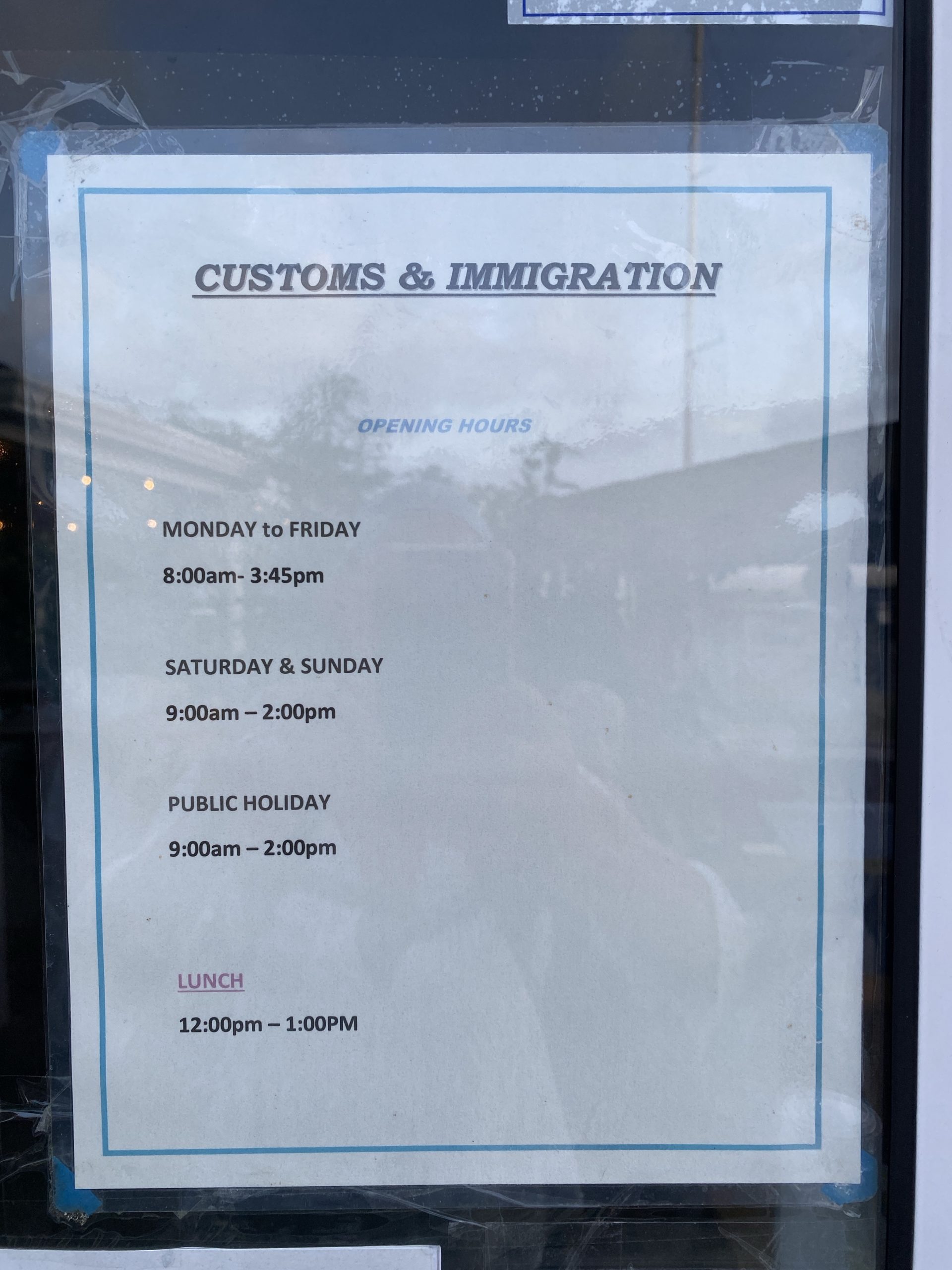 Heute sind wir früh dran um auszuklarieren. Der Mitarbeiter der Einwanderungsbehörde ist alles andere als erfreut beim Spiel auf dem Smartphone gestört zu werden. Solche Reaktionen sind wie Regenwetter, man kann sie sowieso nicht ändern, warum also sollte man sich ärgern? Wir füllen alle sechs Durchschläge ordnungsgemäß aus, verlassen dazu auf Anweisung das Büro, starten freundlich einen neuen Versuch und erhalten den benötigten Stempel.