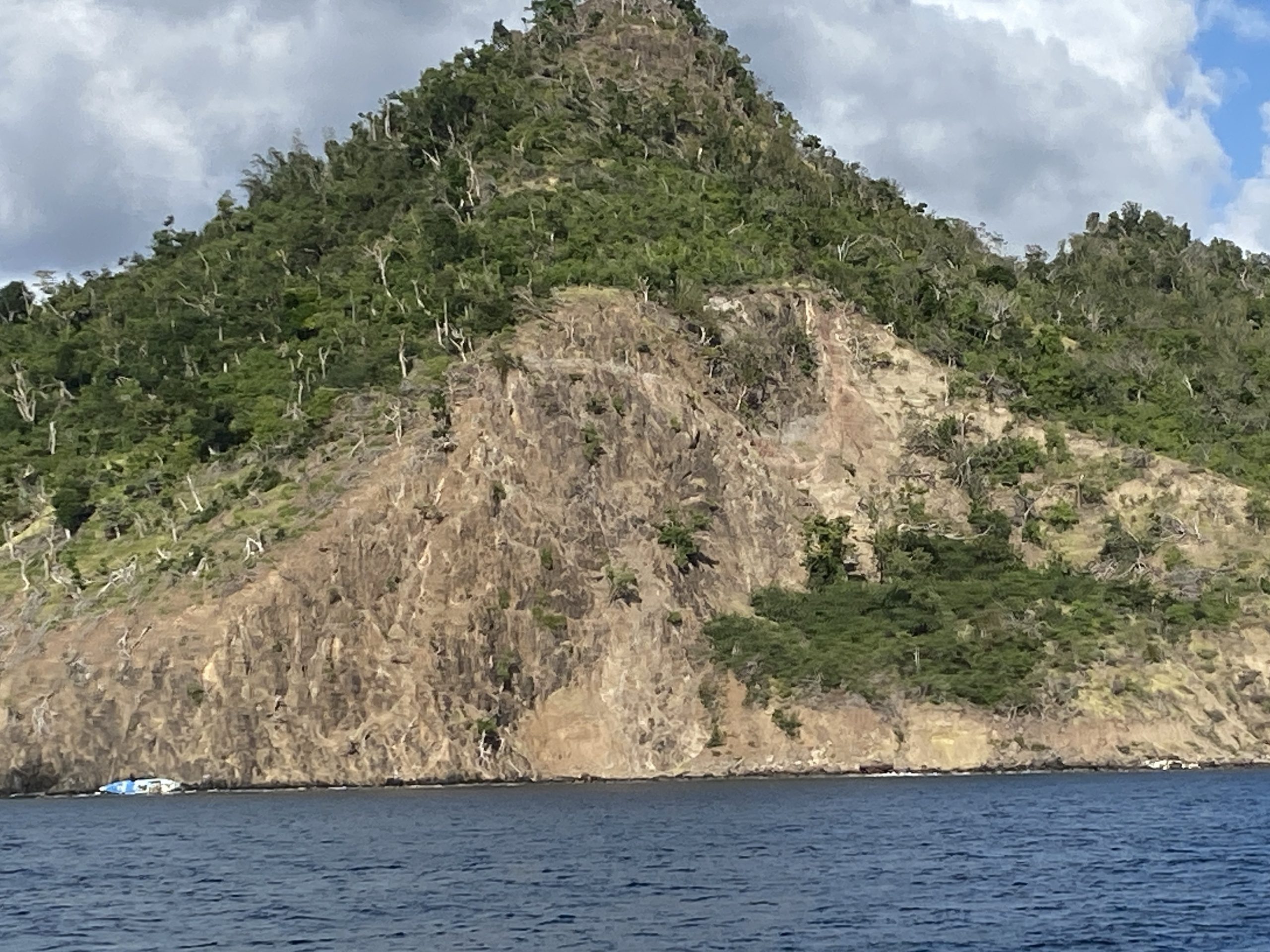 Solche kleinen Alltagsschwierigkeiten sind nichts gegenüber dem was in der Bucht immer noch zu sehen ist. Die Inseln im Süden der Kleinen Antillen gelten unter Seglern als guter Ort um in der Hurrikansaison von Juli bis November in Deckung zu gehen. Der letzte Hurrikan, der so weit südlich entlangzog, war Ivan im Jahr 2004. Am 01. Juli 2024 liegt das Auge des Hurrikans Beryl genau über Carriacou und fegt mit 240km/h innerhalb einer halben Stunde alles von der kleinen Insel. Häuser werden abgedeckt oder komplett abgetragen, Bäume entwurzelt, Autos zerstört und Schiffe auf den Strand oder die Riffe geblasen. Viele Existenzen sind mit einem Mal bedroht. Wir sehen viele Häuser, die mit Planen als Dach gedeckt sind. Andere Häuser sind aufgegeben. Viele Yachten in der Bucht liegen ohne Mast dort, andere sind an der Küste zerschellt. Die Menschen auf den Straßen sind trotzdem freundlich und offen. Gejammer ist nirgends zu hören.