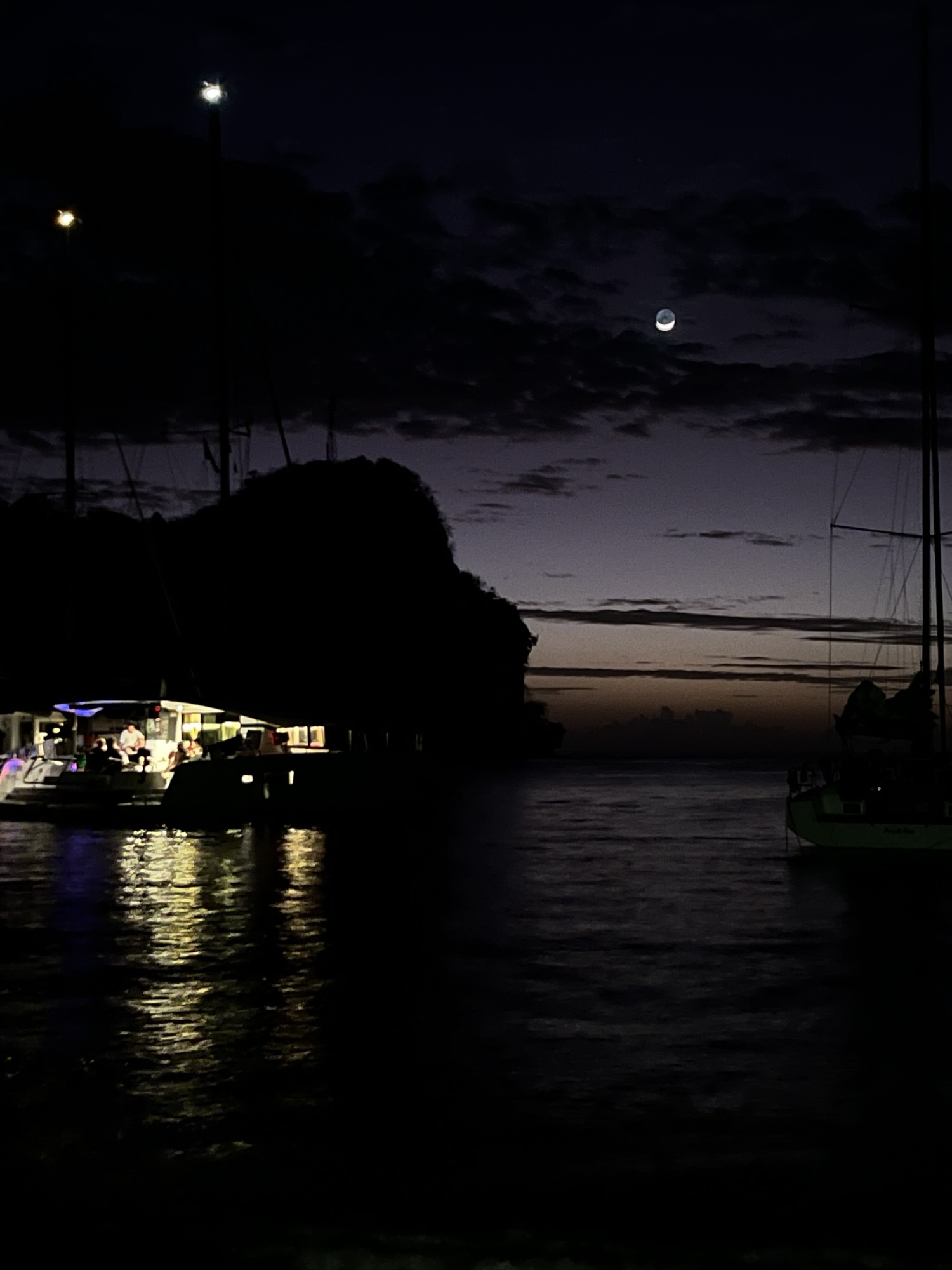 Gestern Abend waren wir auch an Land, haben eine kleine Runde am Strand entlang gedreht und den ersten Rumpunch in der Bar von Antek getrunken. Der Strand ist hier aus schwarzem Sand, die Insel ist eine Vulkaninsel. Die Bar ist absolut urig aus rohem Beton und sollte wahrscheinlich mal ein Haus werden, das nicht fertiggestellt wurde. Wir nehmen uns zwei Monoblockstühle aus dem Inventar und setzen uns auf den Weg neben der Baustelle. Der Rumpunch besteht aus Eiswürfeln, Rum, Ananas- und Orangensaft mit Fruchtfleisch und wird mit Muskatnuss abgeschmeckt. Schmeckt schon auch lecker;)