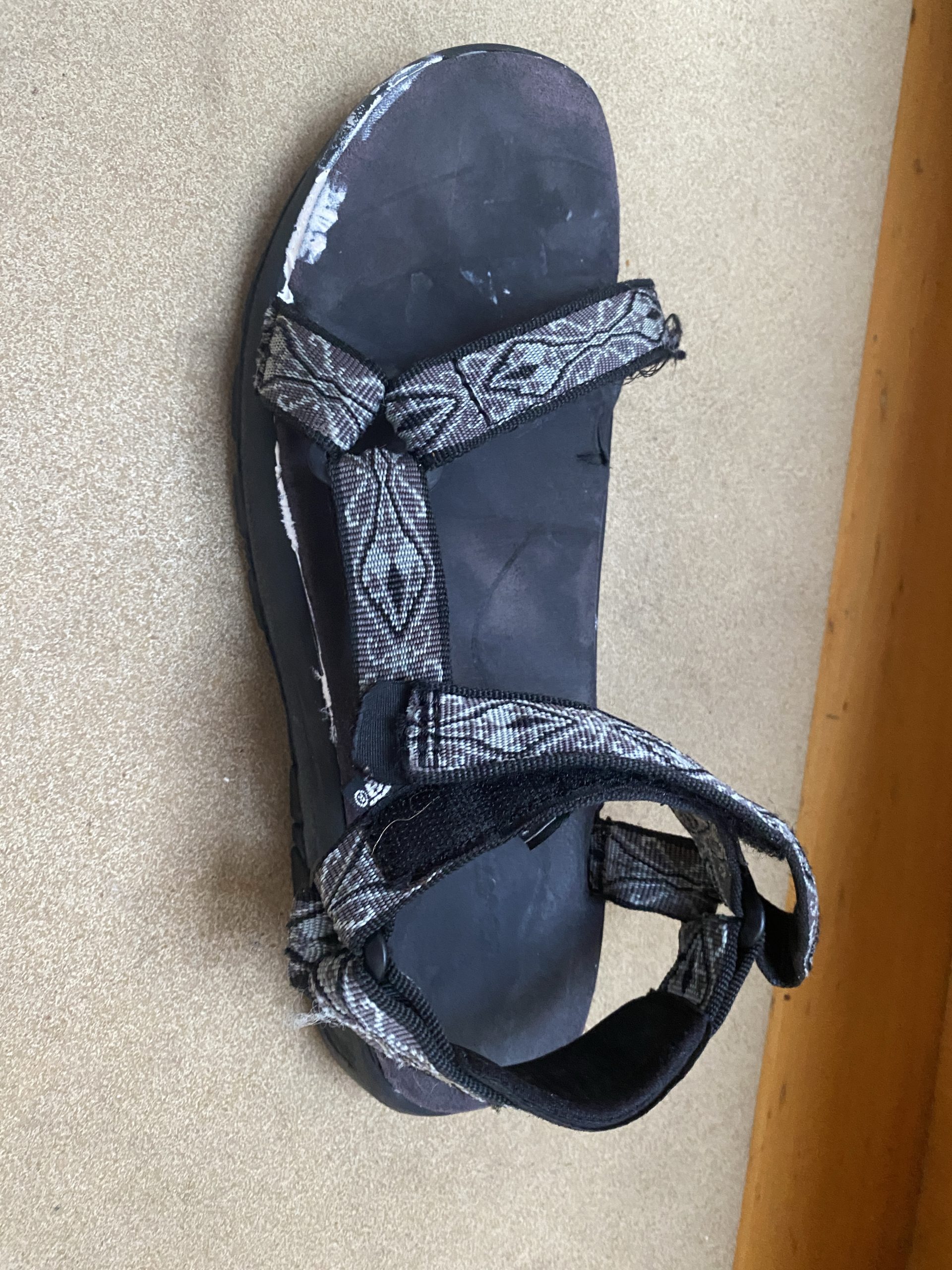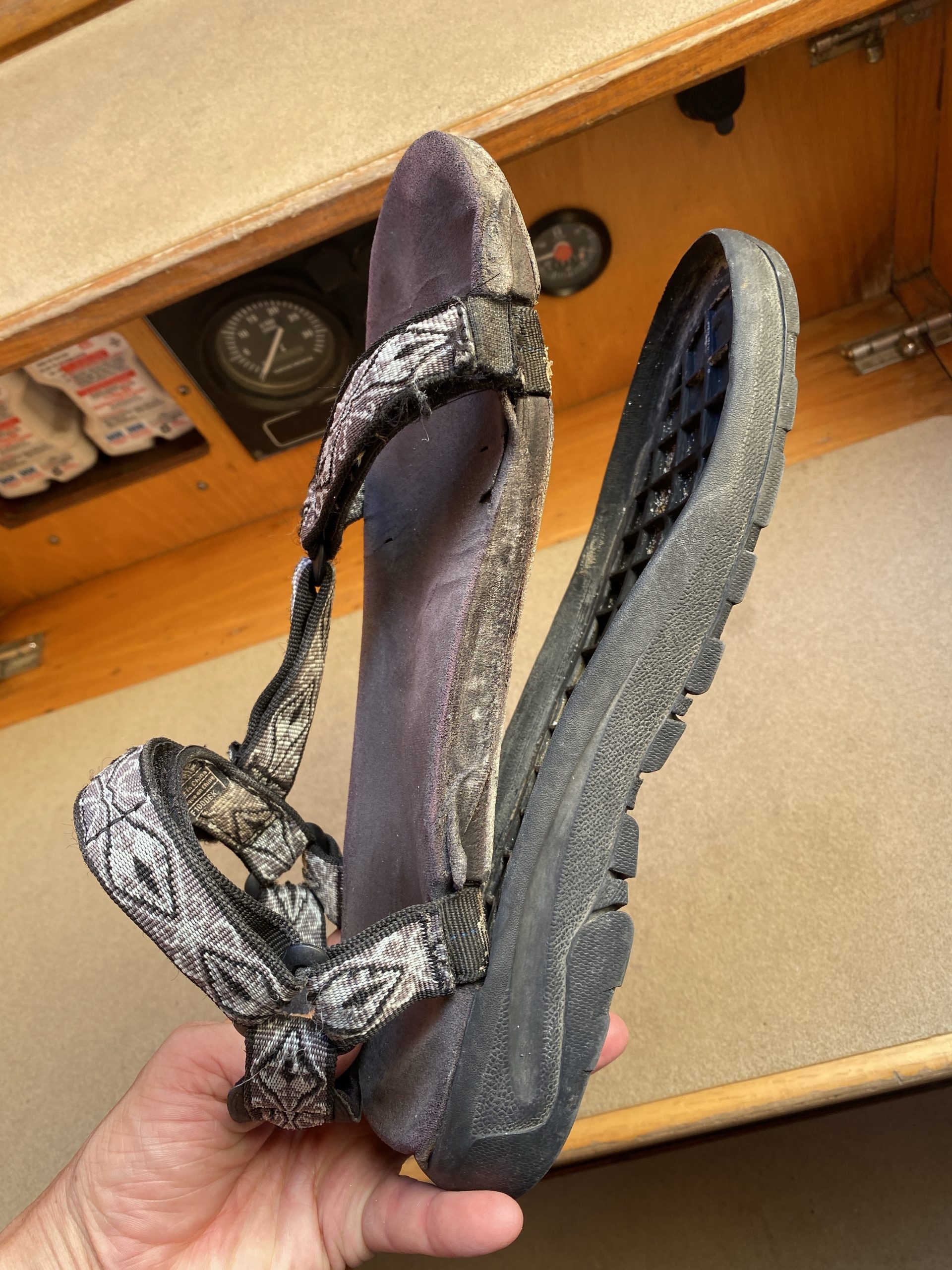 Heute fallen meine Sandalen endgültig auseinander. Auch schon vor knapp 30 Jahren wurde in China produziert. Salzwasser und Sonneneinstrahlung sind eine Kombination, die vieles dahinrafft, aber nichts was nicht mit Bordmitteln in den Griff zu bekommen wäre. Am nächsten Morgen sind die Sandalen repariert, auch wenn ein wenig Pantera Marine Sealant den Weg aus der Sohle gefunden hat.