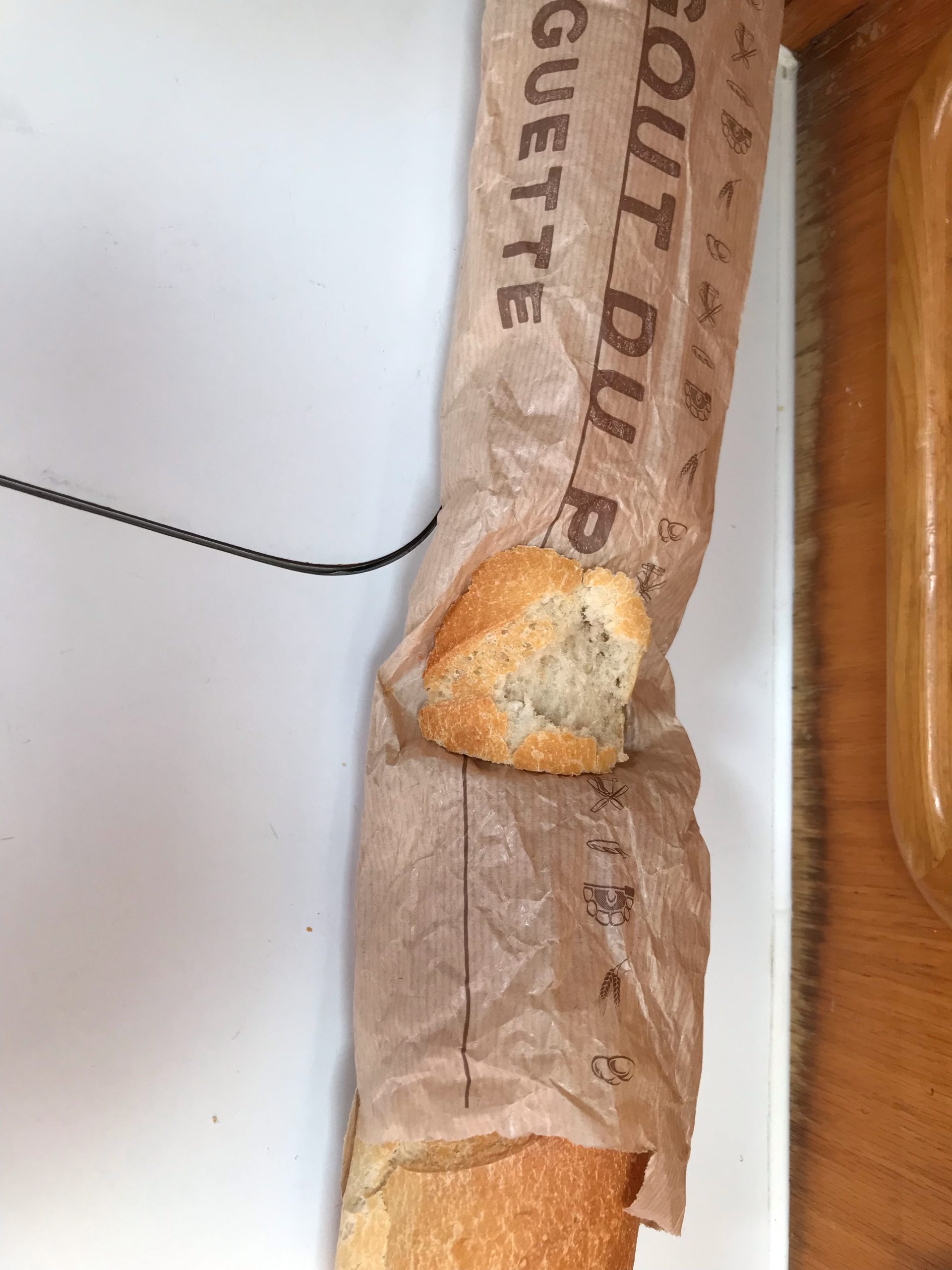 Ich bin etwas früher dran als sonst, da ich mir in dem Supermarkt ein Baguette kaufen möchte. Wenn ich erst nach dem Tauchen hingehe, ist nicht sicher ob es noch eins gibt, also bin ich vorher hin. Das Baguette habe ich in der Basis liegen lassen, damit es auf dem Boot nicht nass wird. Da die Basis während der Tauchfahrt verschlossen ist, habe ich mir nichts dabei gedacht. Die Fenster sind vergittert und bleiben geöffnet, diesen Umstand habe ich vorher nicht bemerkt. Nachher habe ich dafür bemerkt, dass ich einen Mitesser gefüttert habe, vielleicht einen Vogel, der ins Haus geflogen ist.