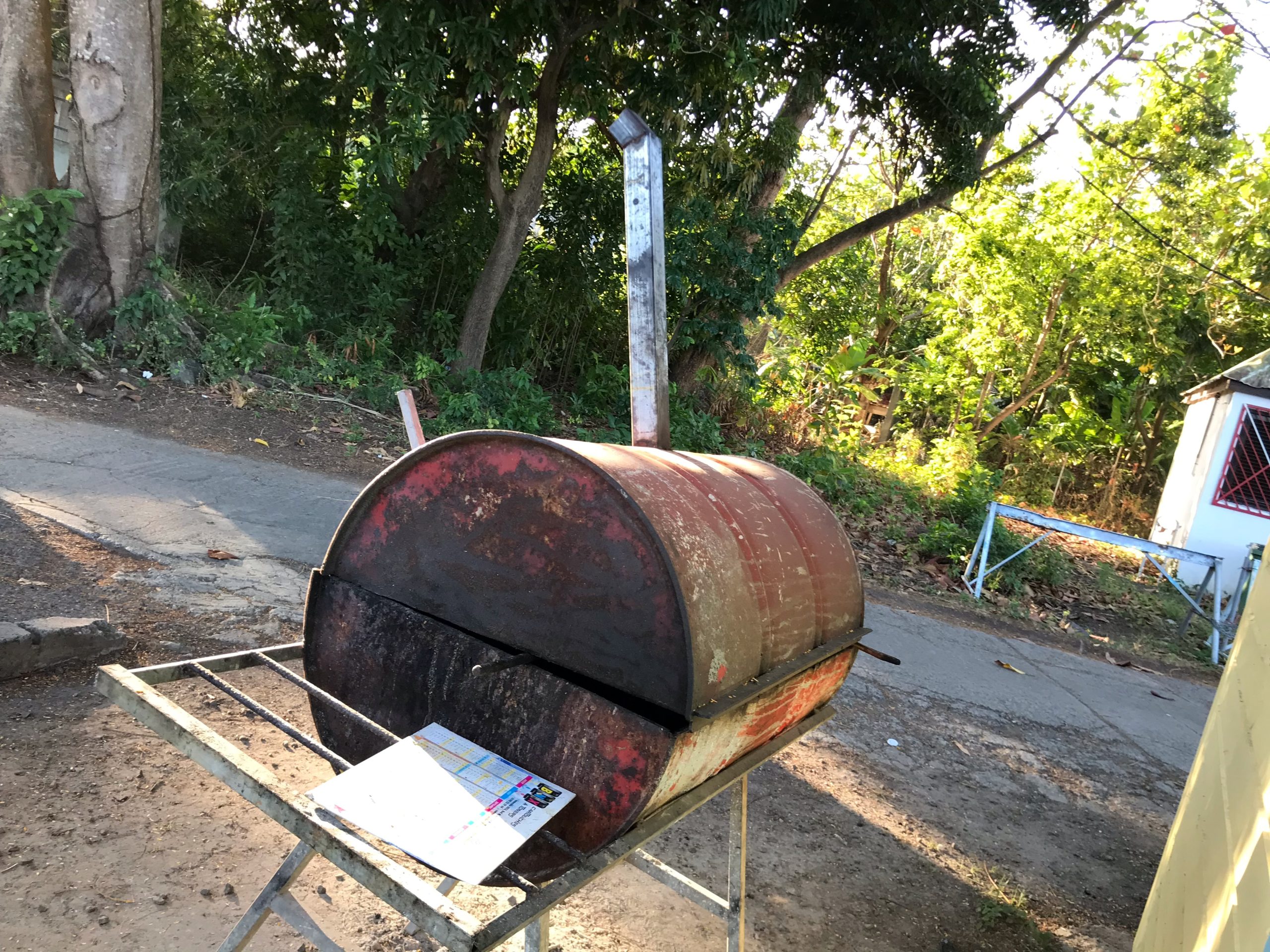 Die Hauptbestandteile der Gerichte werden gegrillt, der Grill ist eine Wiederverwendung eines Fasses mit Ofenrohr.