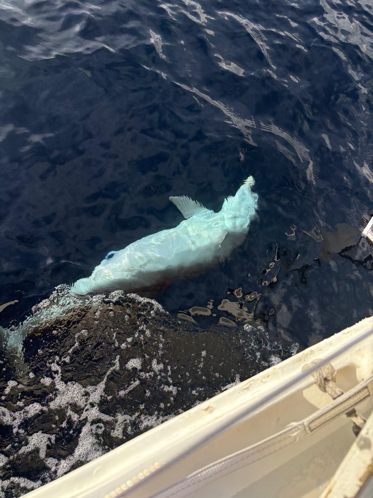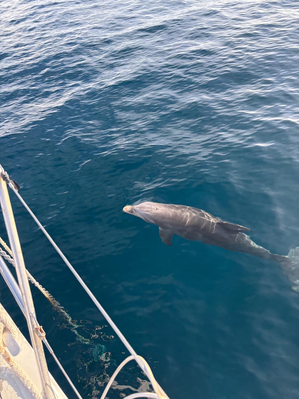 Wir besprechen den Ablauf des nächsten Tages, fahren zum Boot und treffen auf die Delphindame aus der Tauchbucht. Sie hat die gleichen drei Schrammen an der Finne und mag genau so gerne die Ankerkette entlang tauchen. Bevor wir in der Petit Anse ankern, genießen wir den Anblick.