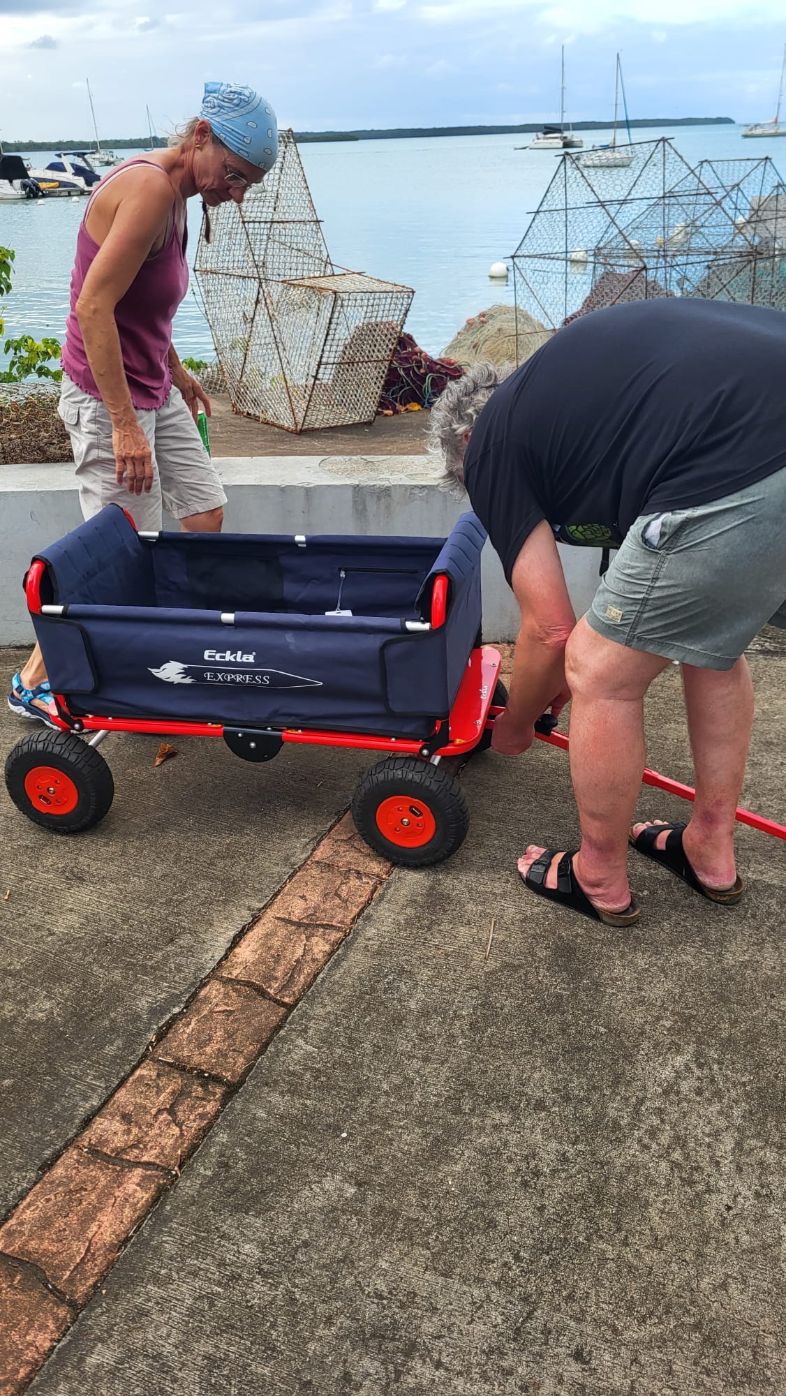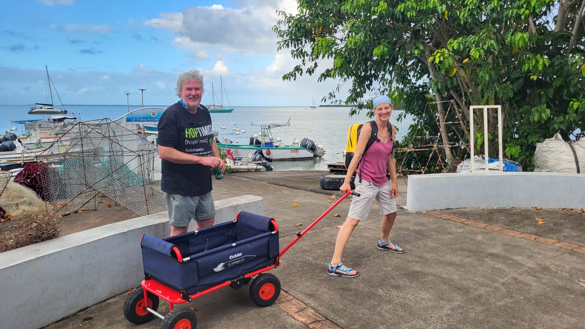 In der Bucht angekommen fahren wir mit dem Dinghi an Land, bauen den Bollerwagen auf und machen den großen Carrefour unsicher.