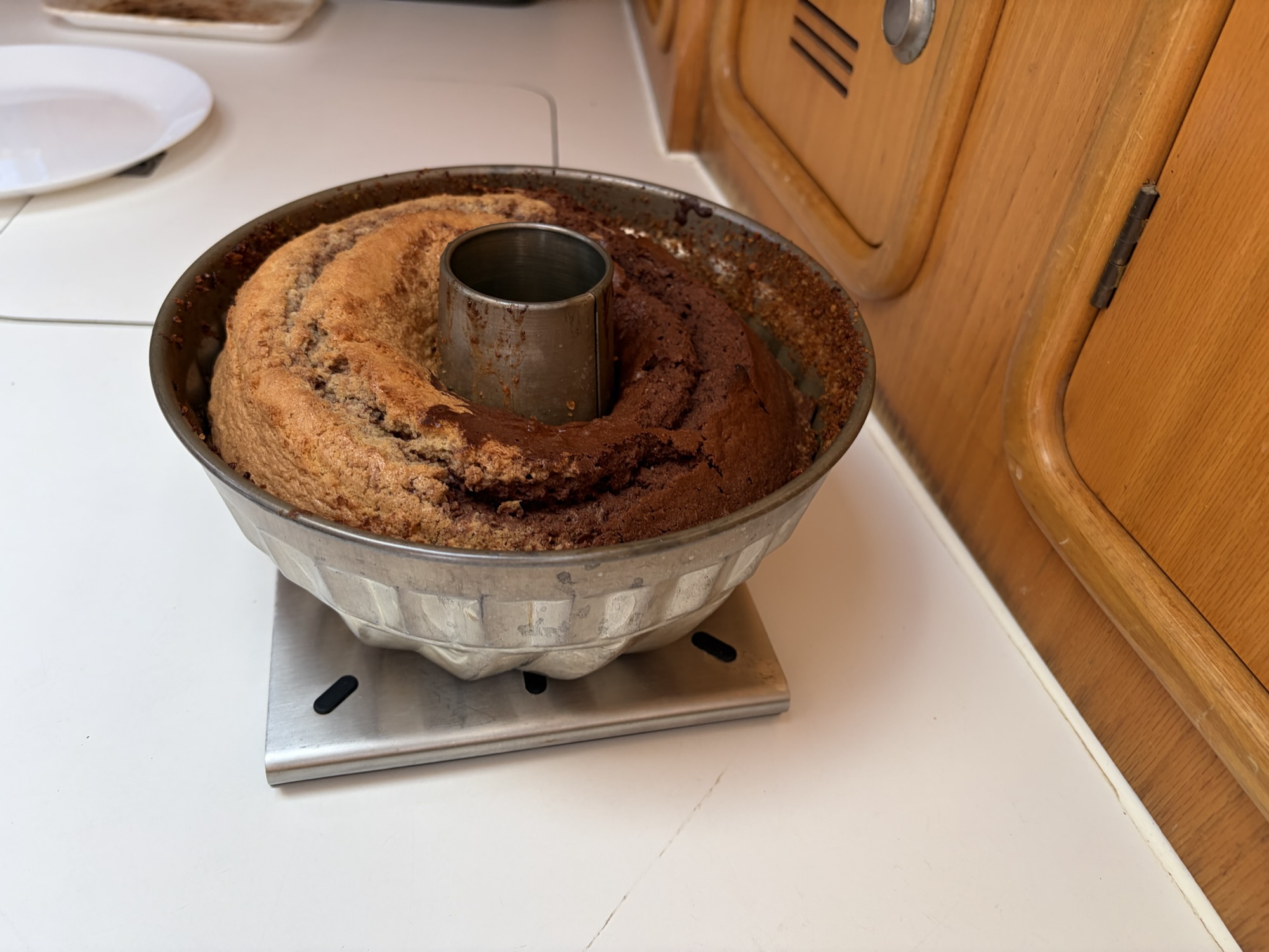Nach all dem Gedöns backe ich einen Kuchen. Es wird eine Mischung aus hellem und dunklen Rührkuchen und Marmorkuchen, damit alle ihren Lieblingsanteil erhalten können. Ein wenig sieht man dem Kuchen den Seegang an.