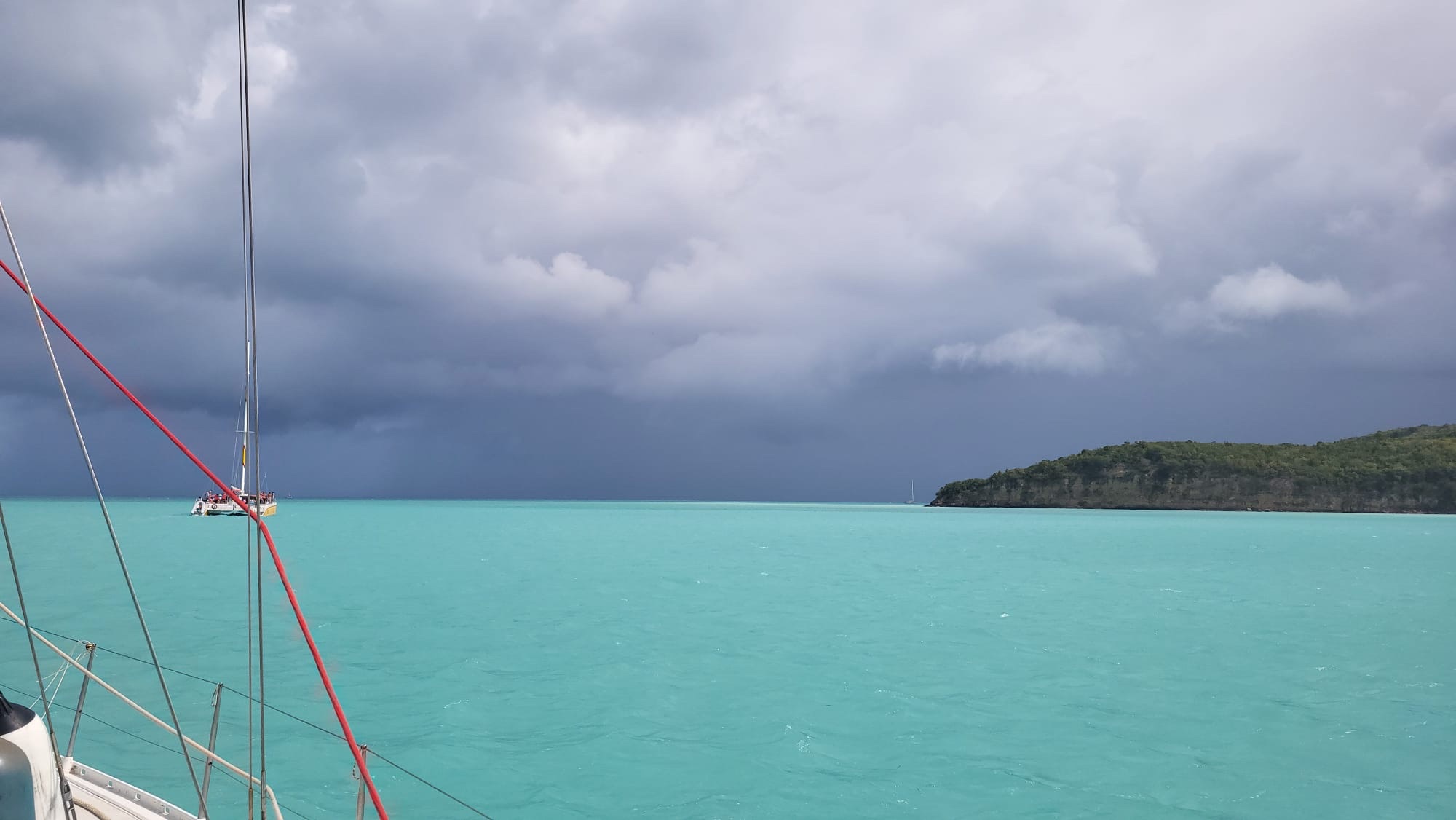 Da es dann deutlich stärker regnet und dabei auch etwas stürmischer weht, beschließen wir nach kurzer Diskussion doch nicht nördlich um die Insel zu fahren, sondern zurück nach Süden zu segeln und auf diesem Weg nach English Harbour zu kommen.