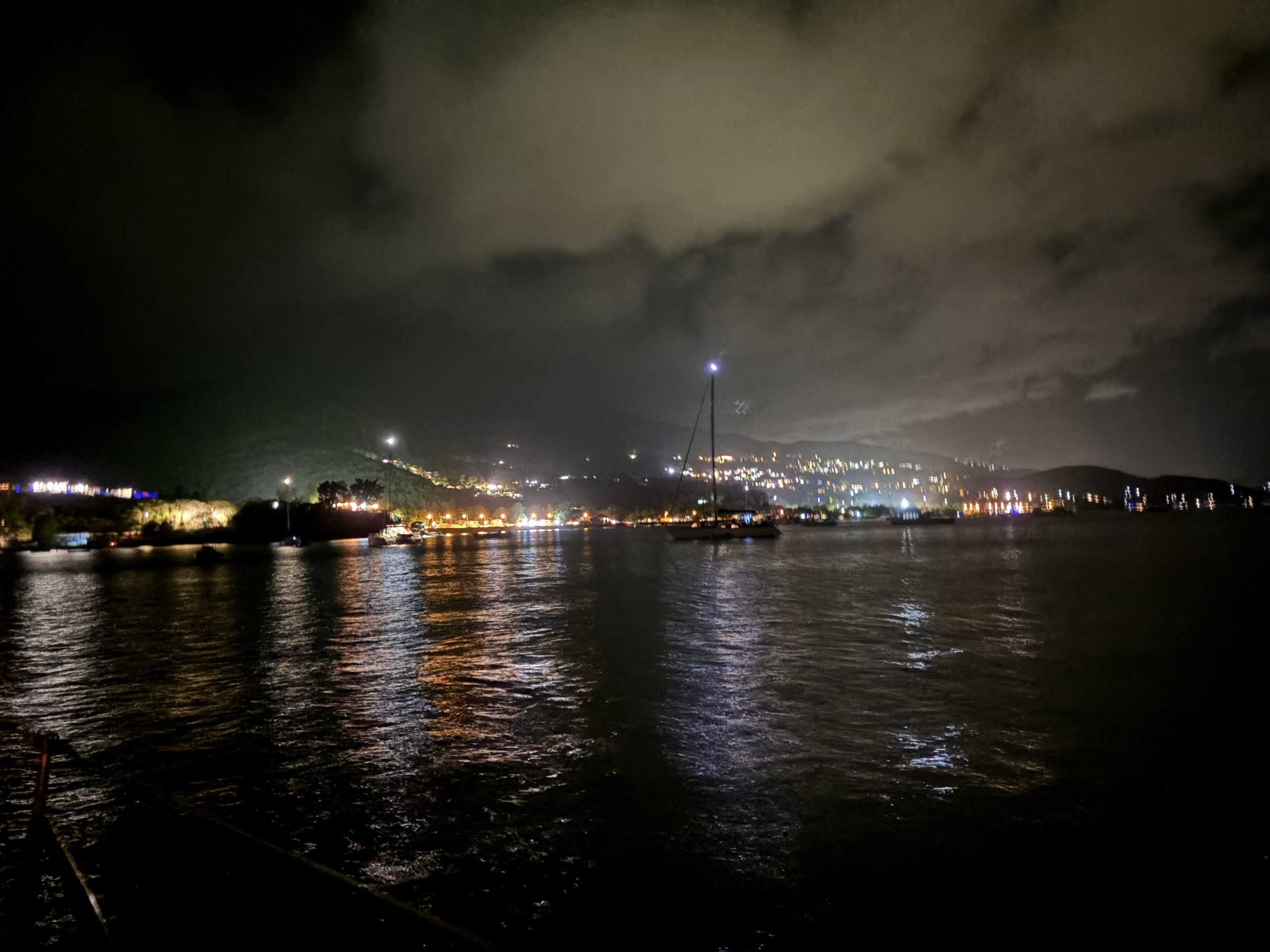 Wir sind überrascht, wieviele Häuser mit ihrem Licht an den bewaldeten Hängen der Bucht die Nacht erhellen.