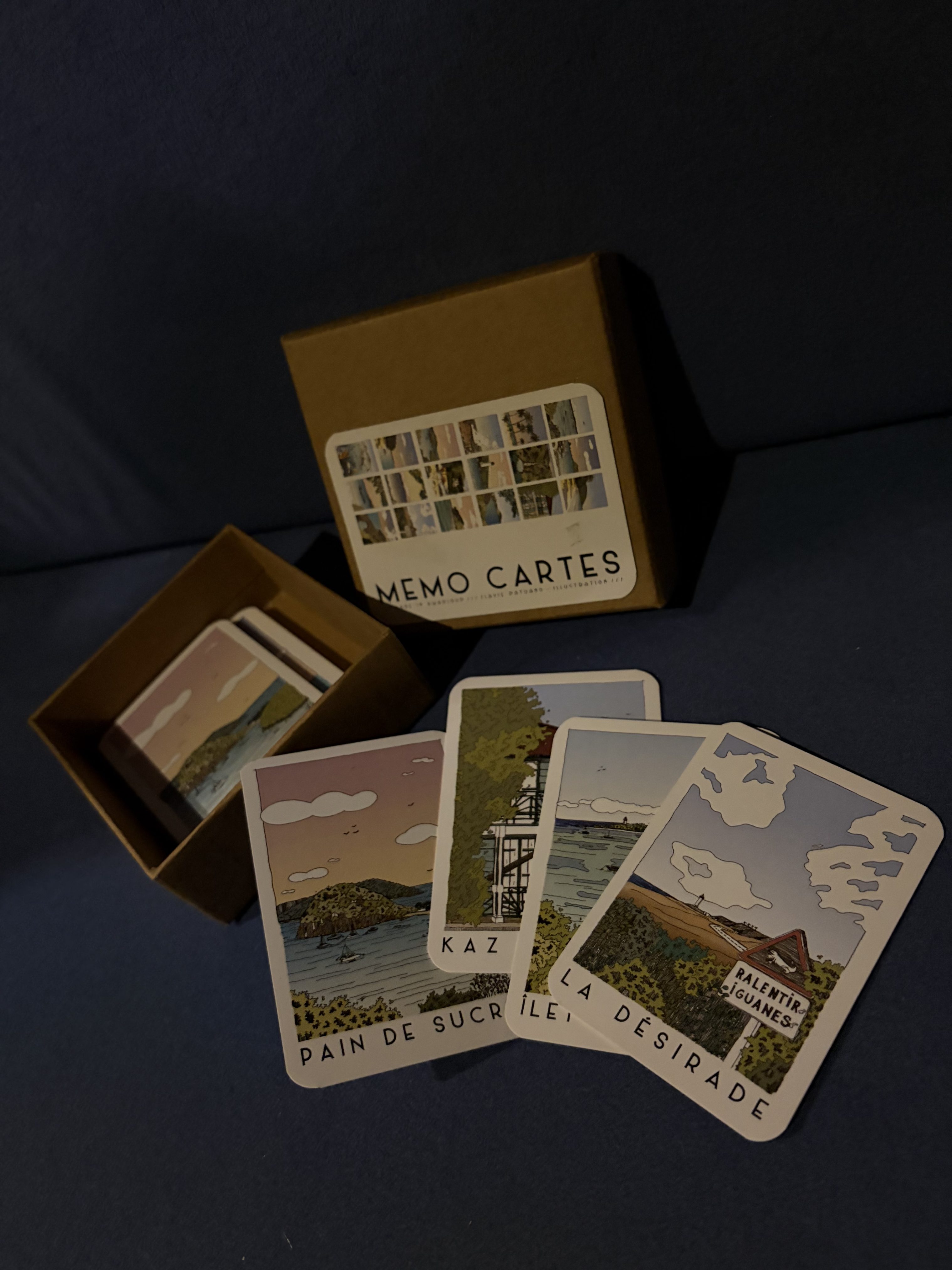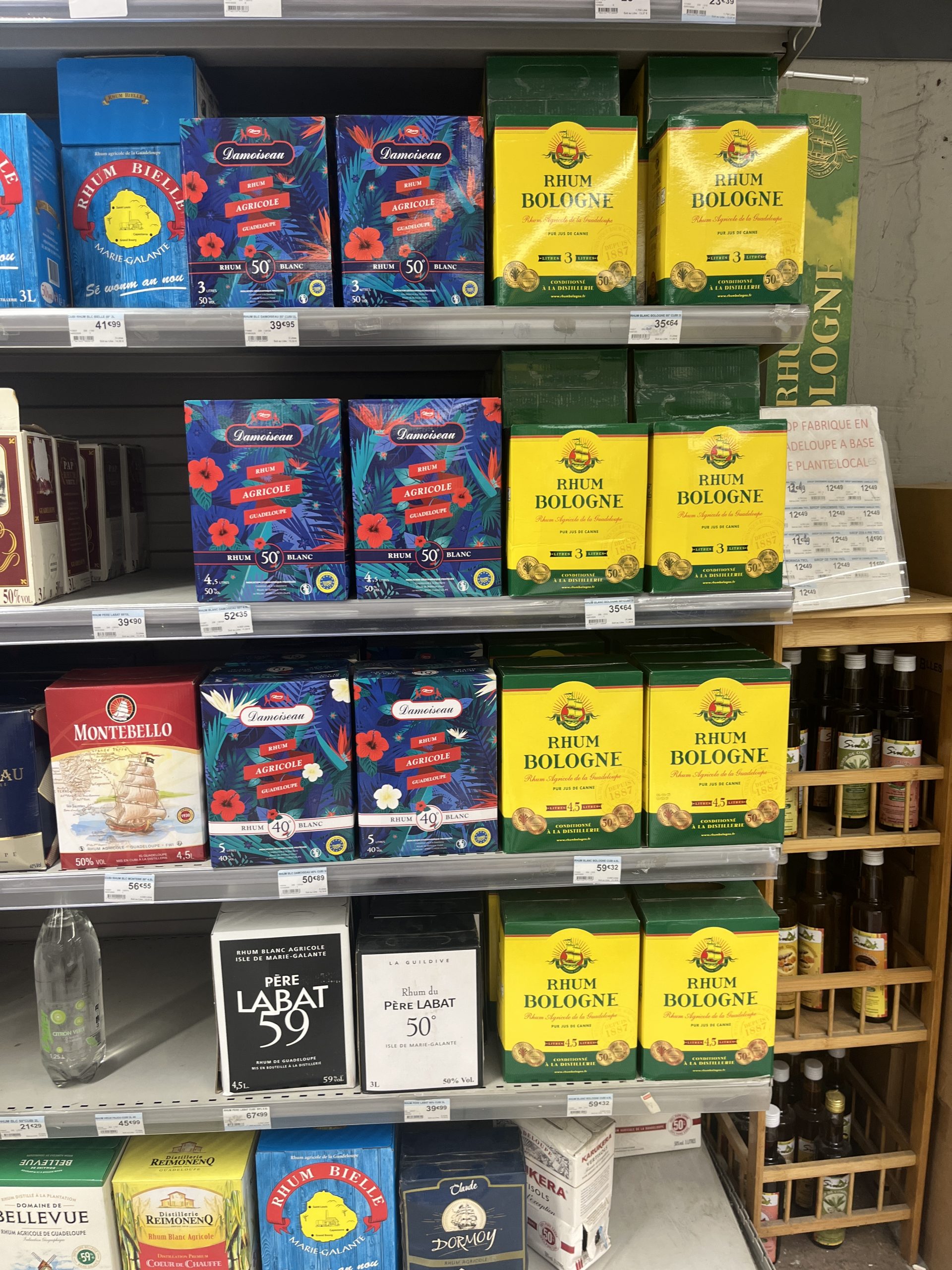 Am Ufer entlang kommen wir an kleinen Läden, vor allem einem mit lokalem Kunsthandwerk vorbei. Dort kaufen wir die ersten Postkarten der ganzen Atlantiktour. Das sind keine Fotos, sondern kleine Gemälde. Die nächste Herausforderung wird sein, passende Briefmarken und einen Briefkasten zu finden. Im Carrefour kaufen wir etwas Käse und Butter, beim Bäcker schnell noch zwei Baguette. Aus Südfrankreich kennen wir ja die Weinkartons, aber hier gibt es eben lokales: den Rumkarton.