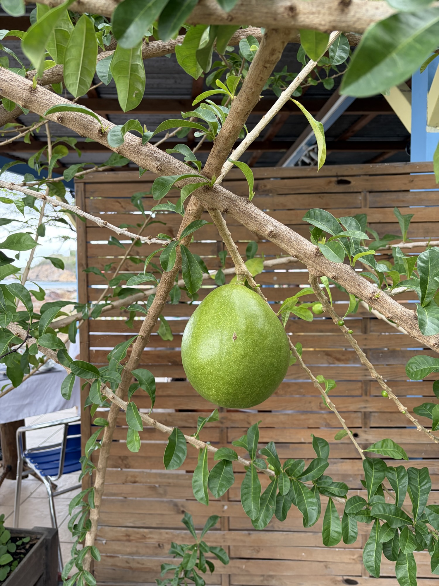 Um das Gebäude herum stehen zahlreiche Pflanzen teils in Form von Bäumen oder Stauden. Bananen und Mango sind uns ja schon gut bekannt, eine Kalebasse haben wir aber noch nicht gesehen, dabei wächst der Baum direkt am Restaurant.