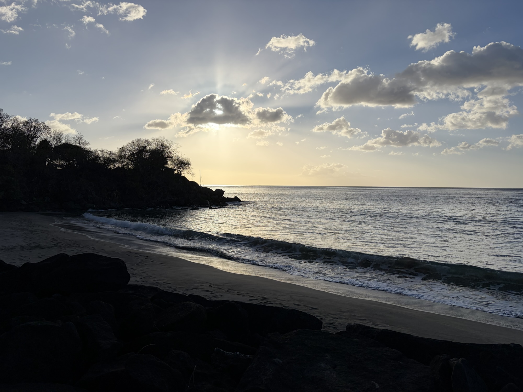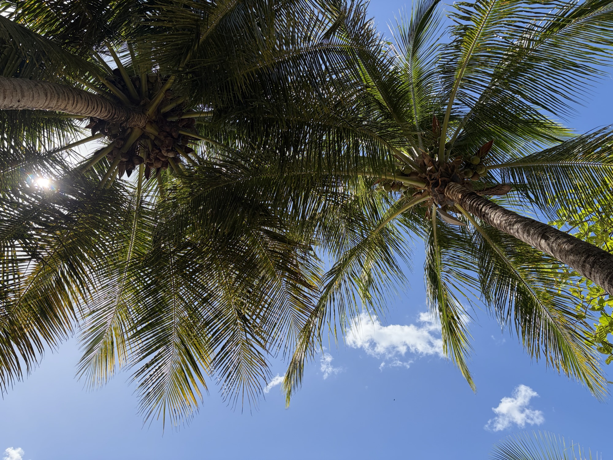 Trotz Lichtschutzfaktor 50 an allen möglichen und unmöglichen Stellen des Körpers brennt die Sonne und lässt uns immer weiter in den Schatten wandern. Letztlich liegen wir nicht mehr im Sand, sondern unter Kokospalmen und müssen aufpassen, dass uns keine Nuss auf den Kopf fällt.