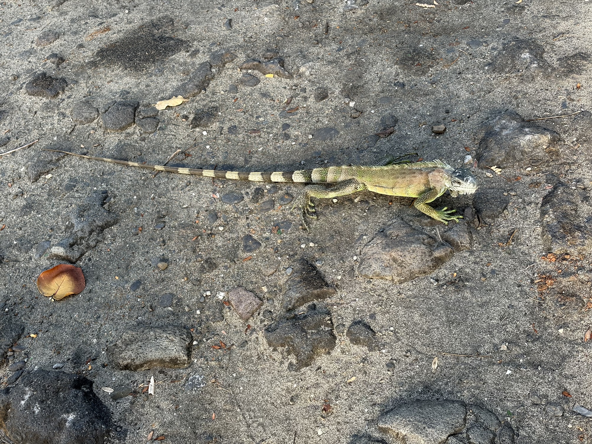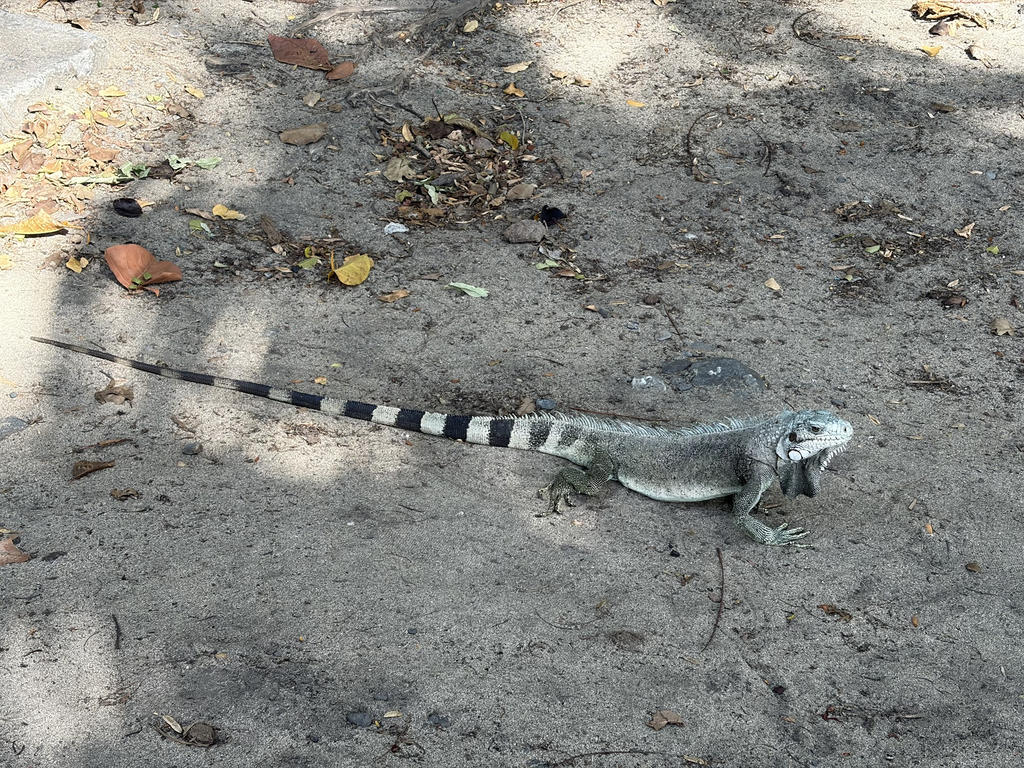 Diesmal treffen wir auch an Land auf allerlei Tiere. Die überall vorhandenen Hühner erwähne ich schon gar nicht mehr. Hier sind mehrere Leguane unterwegs.
