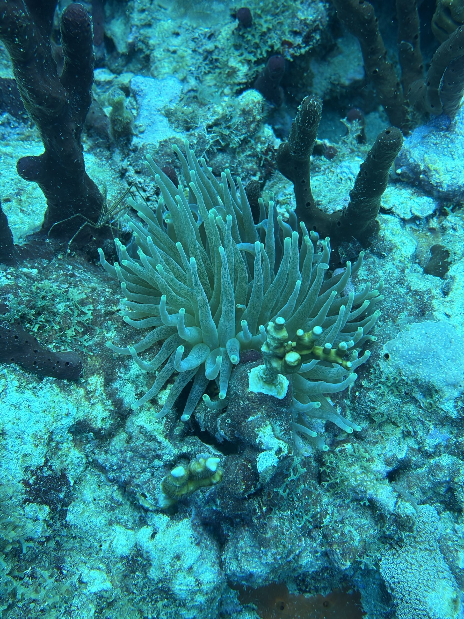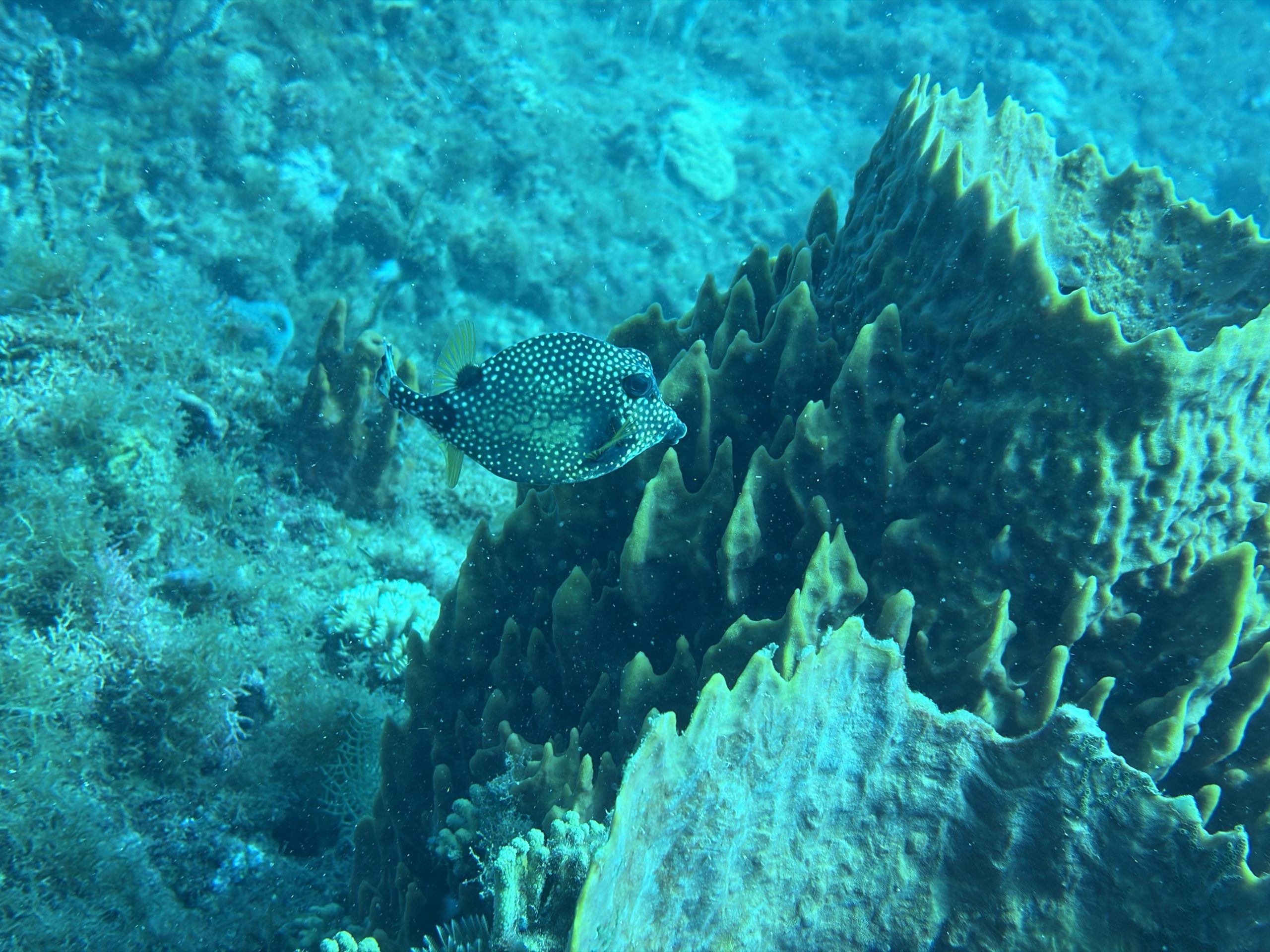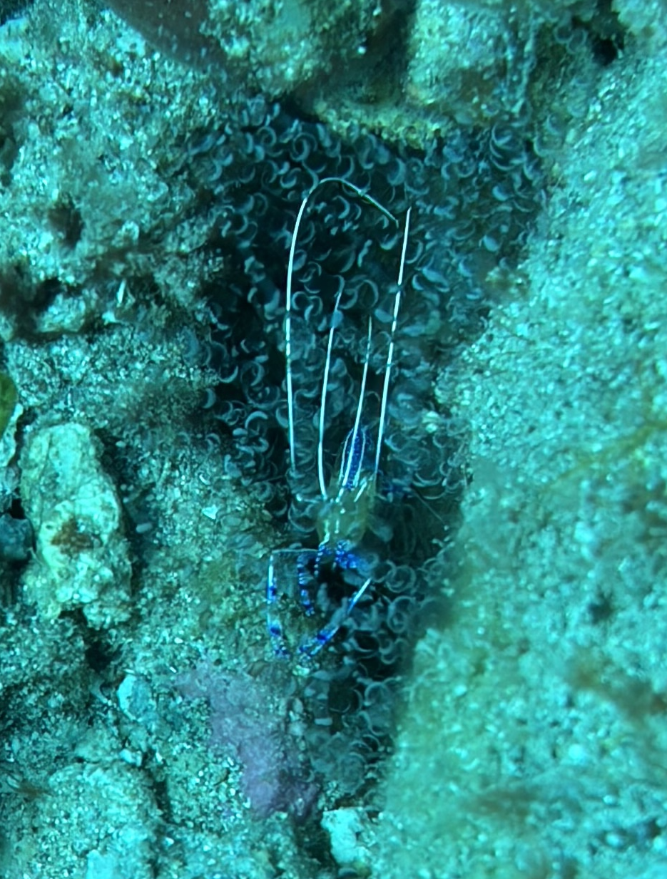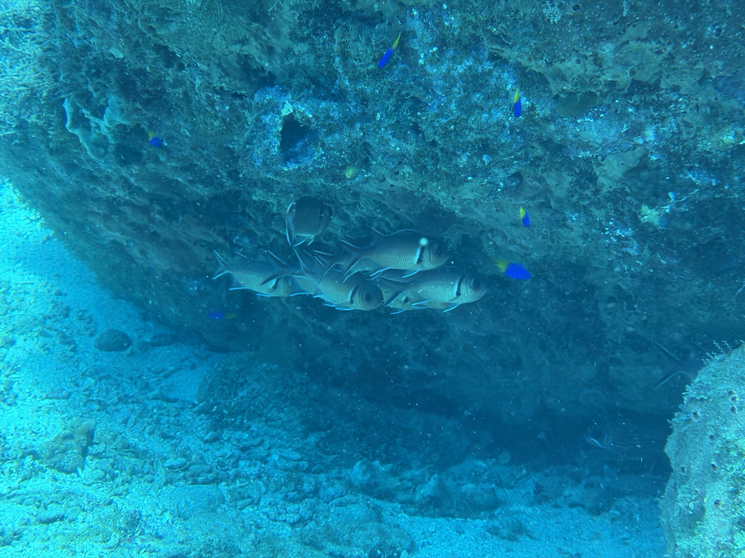 Nach dem Tauchen fahre ich diesmal nicht zurück aufs Boot. Ich habe vorher schon alles eingepackt um mit Andrea und Helmut die warme schwefelhaltige Quelle „Bain Chaud de Thomas“ zu besuchen. Diese Thermalquelle ergießt sich ins Meer und heizt es ordentlich auf. Mal fließt ein wenig kälteres oder auch deutlich wärmeres Wasser an einem vorbei. An der Stelle an der das Wasser mit mehr als 70 Grad Celsius aus der Insel fließt, sind Warntafeln aufgestellt, weil es so heiß ist, dass man sich verbrennen kann. Nach einer Dreiviertelstunde im Wasser haben wir genug. Wir kaufen für den Pizzaabend ein und fahren zurück in das Appartment der beiden.
