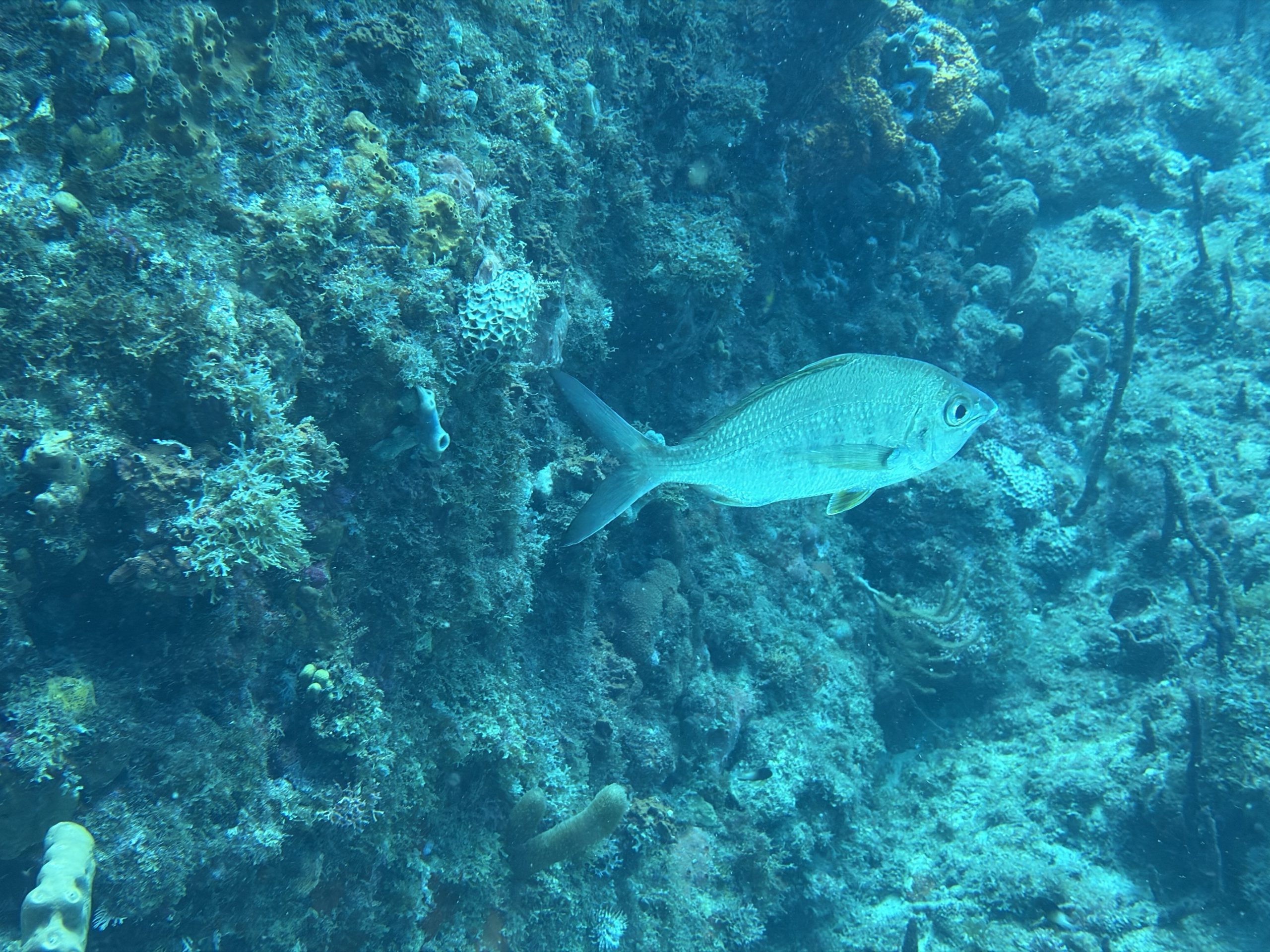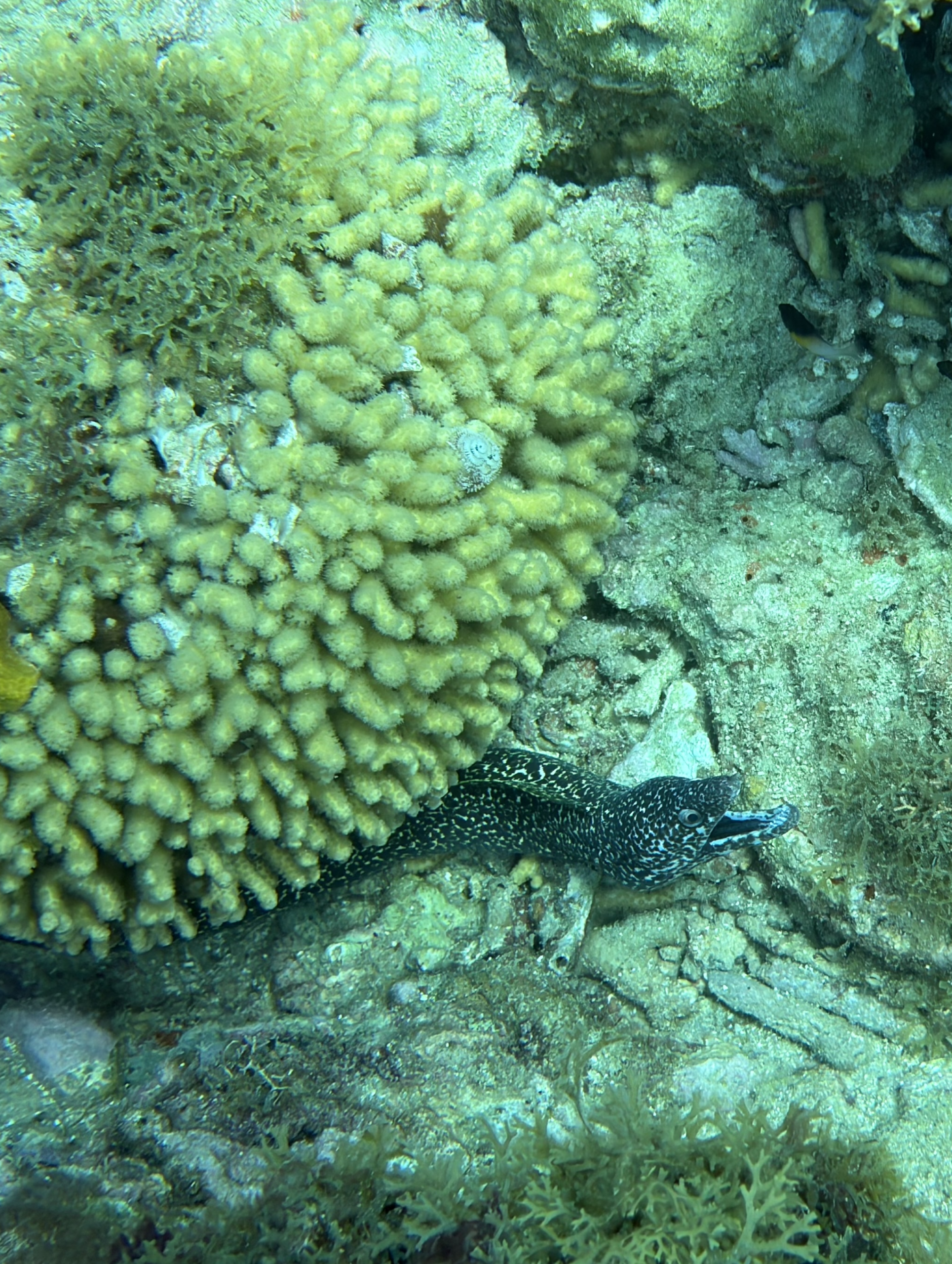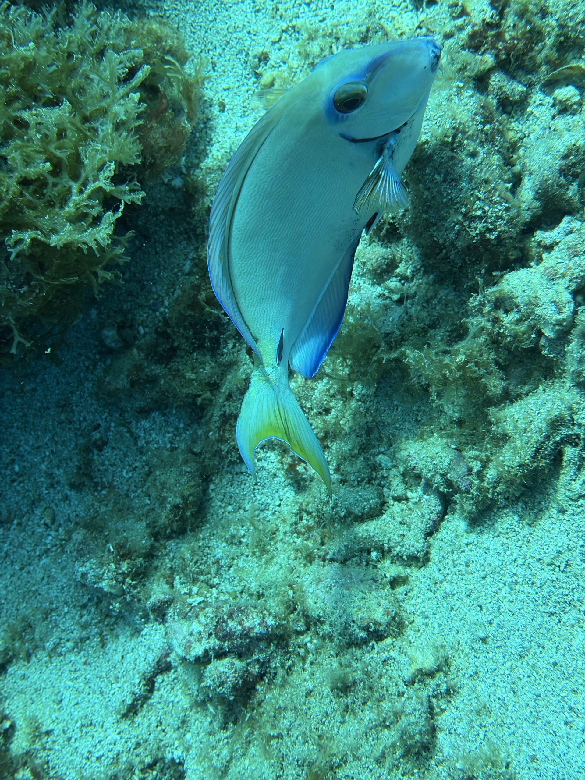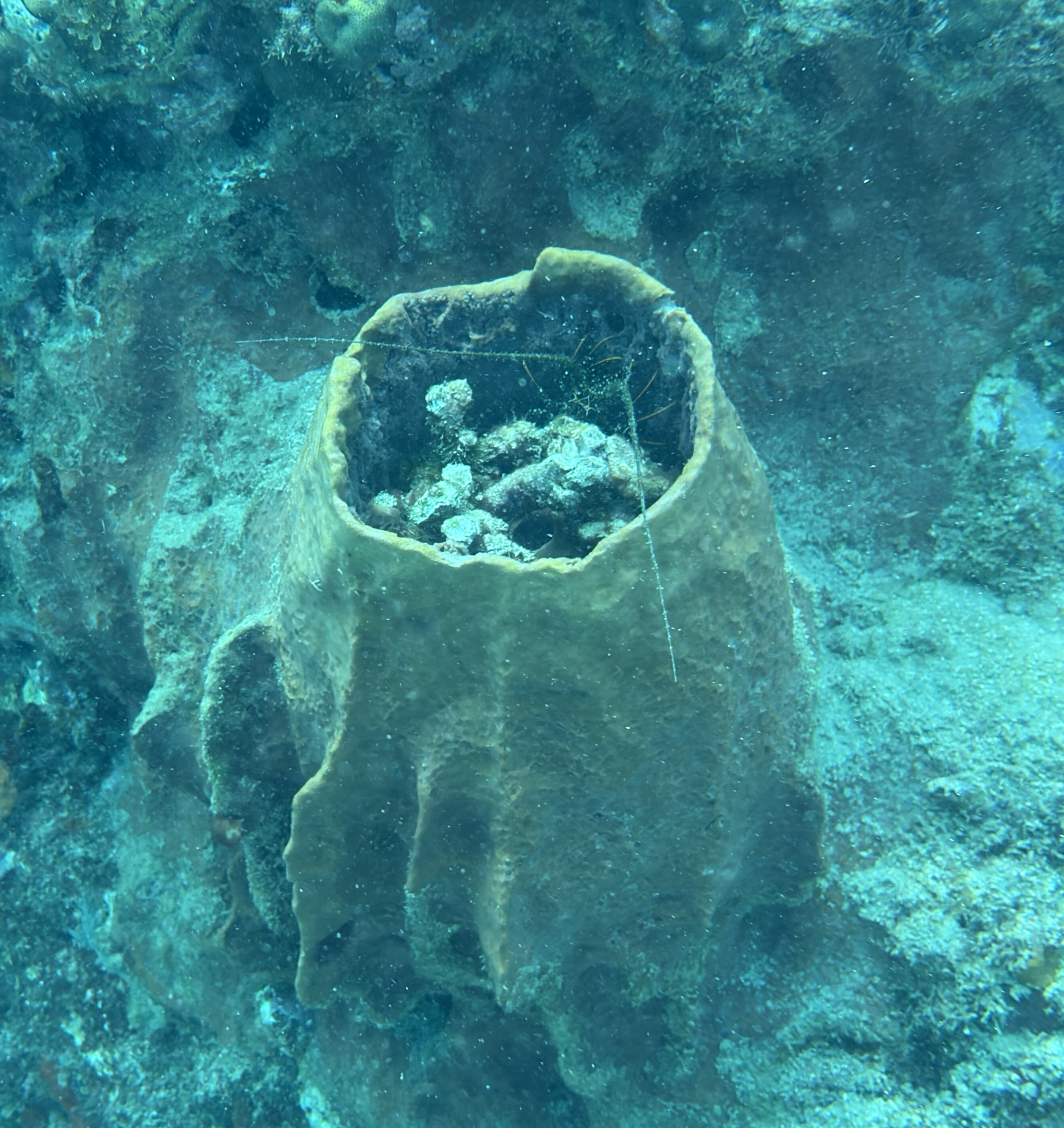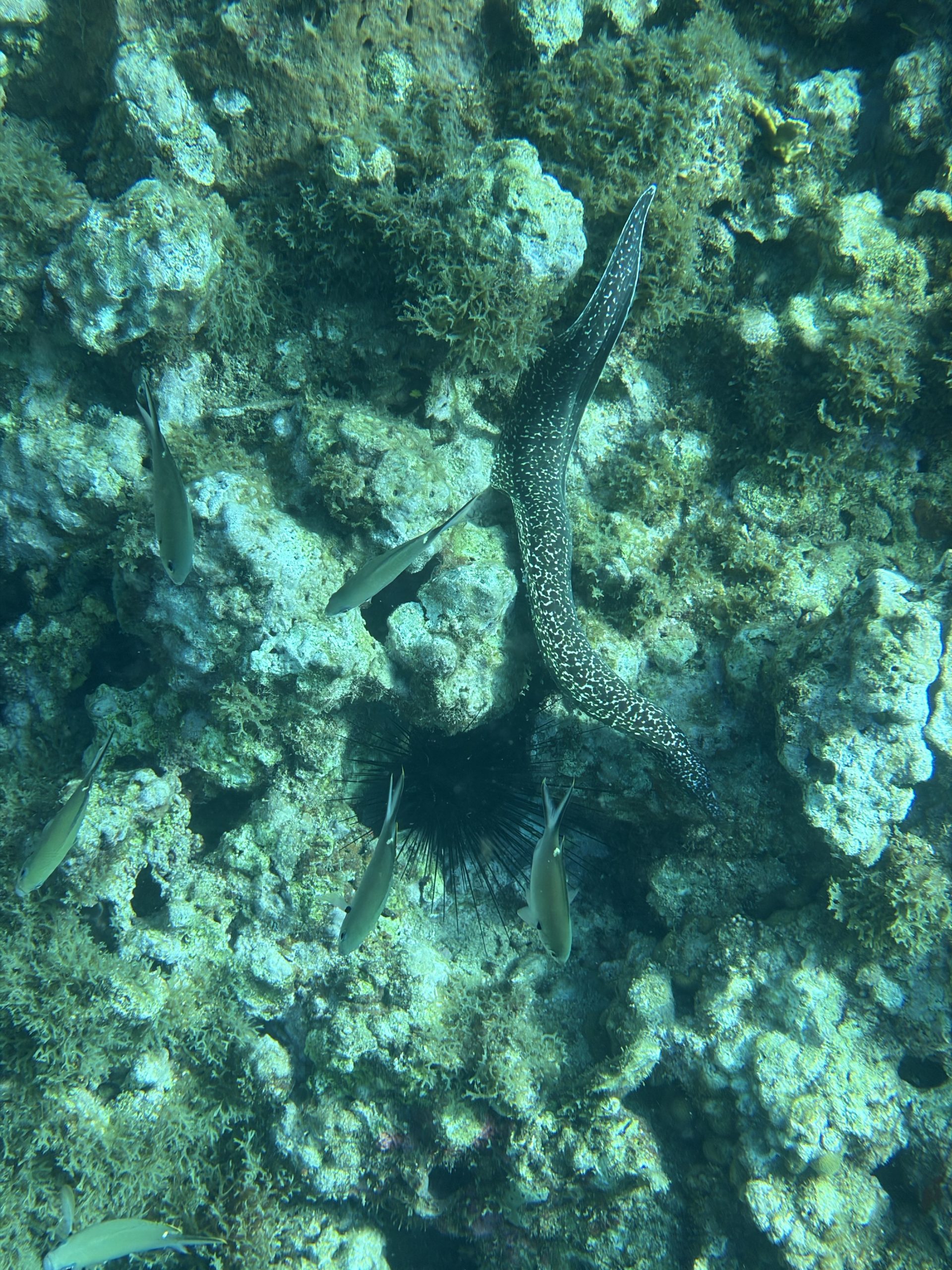 Nach dem Tauchen fahre ich diesmal nicht zurück aufs Boot. Ich habe vorher schon alles eingepackt um mit Andrea und Helmut die warme schwefelhaltige Quelle „Bain Chaud de Thomas“ zu besuchen. Diese Thermalquelle ergießt sich ins Meer und heizt es ordentlich auf. Mal fließt ein wenig kälteres oder auch deutlich wärmeres Wasser an einem vorbei. An der Stelle an der das Wasser mit mehr als 70 Grad Celsius aus der Insel fließt, sind Warntafeln aufgestellt, weil es so heiß ist, dass man sich verbrennen kann. Nach einer Dreiviertelstunde im Wasser haben wir genug. Wir kaufen für den Pizzaabend ein und fahren zurück in das Appartment der beiden.