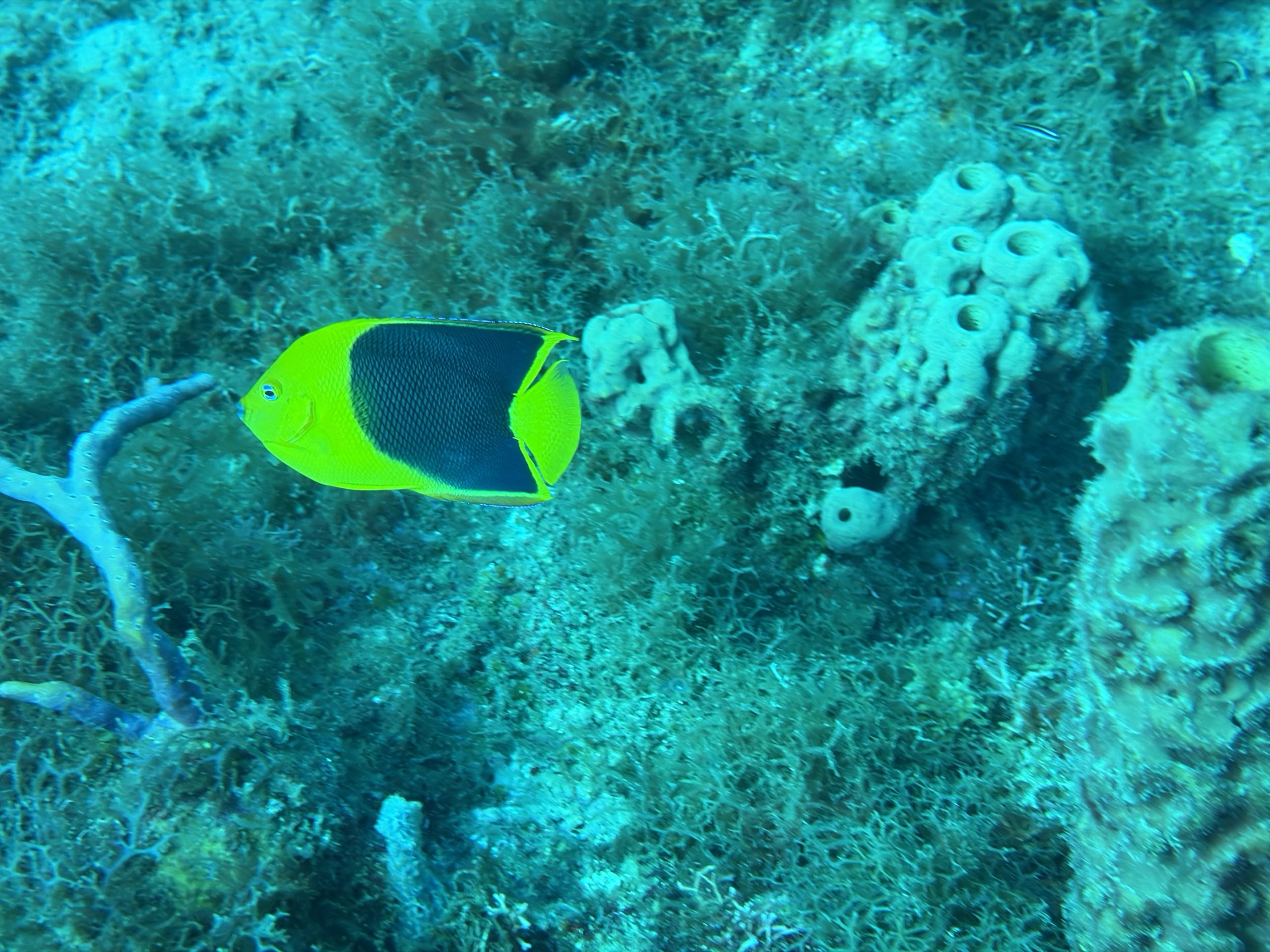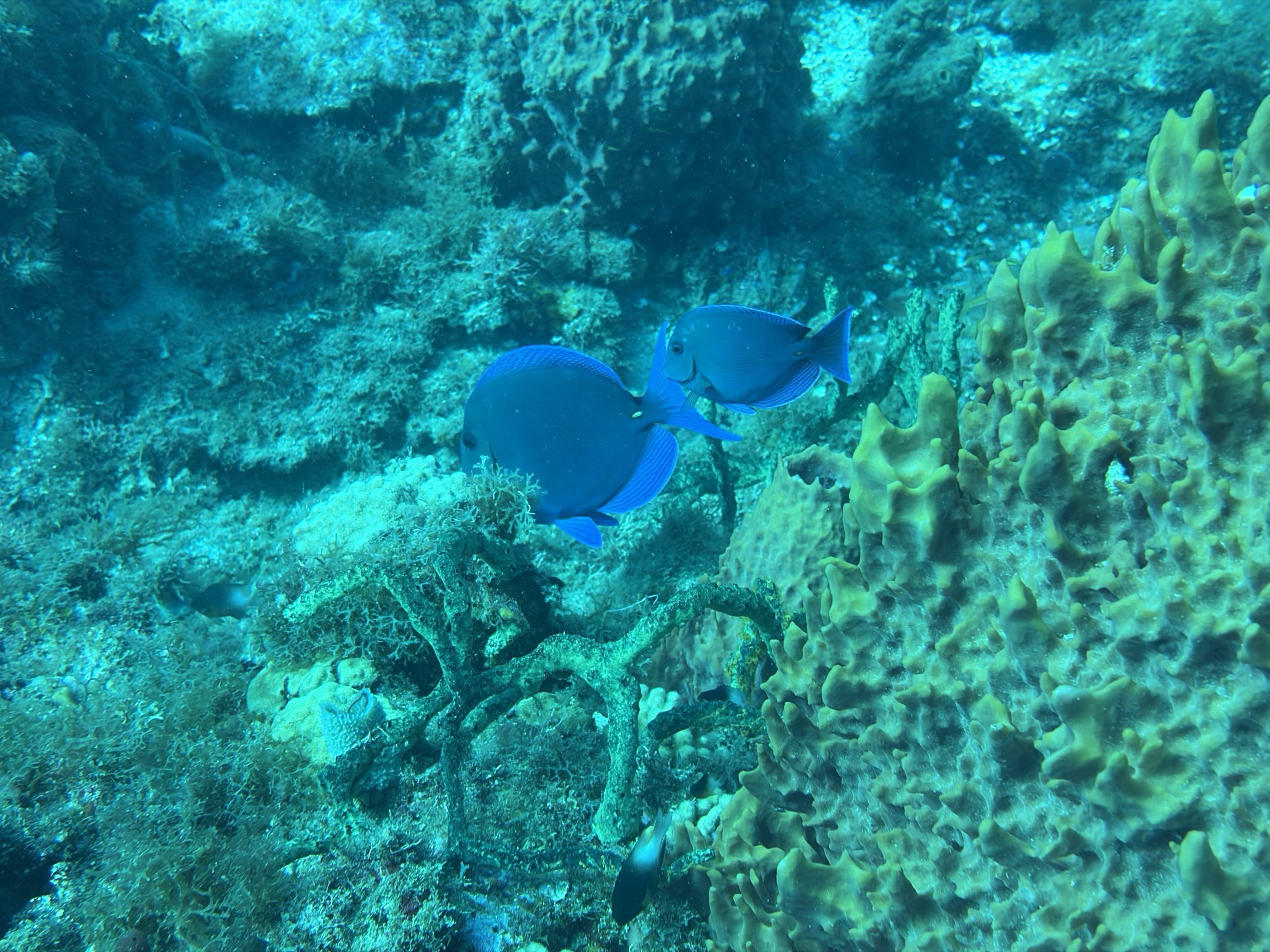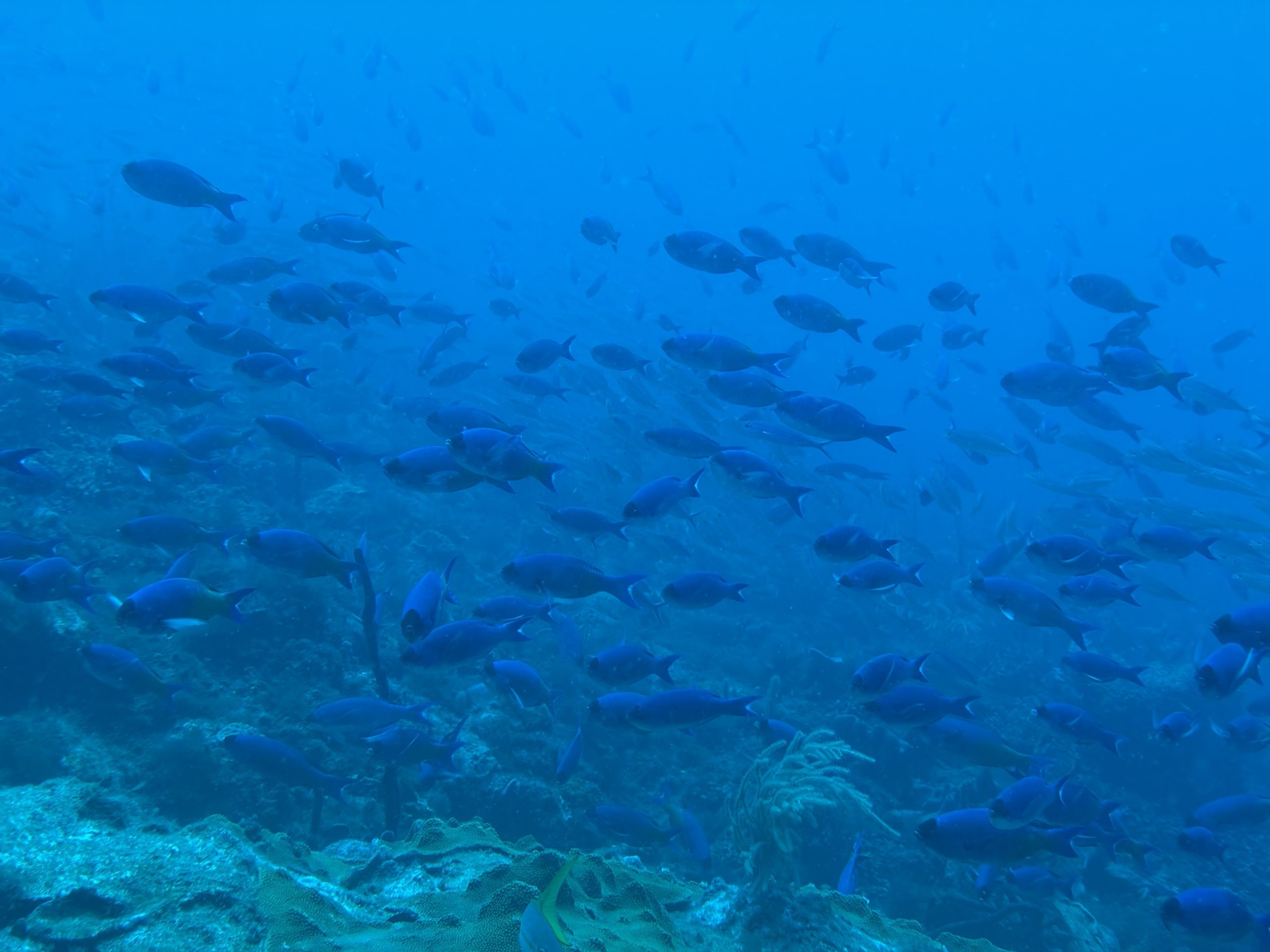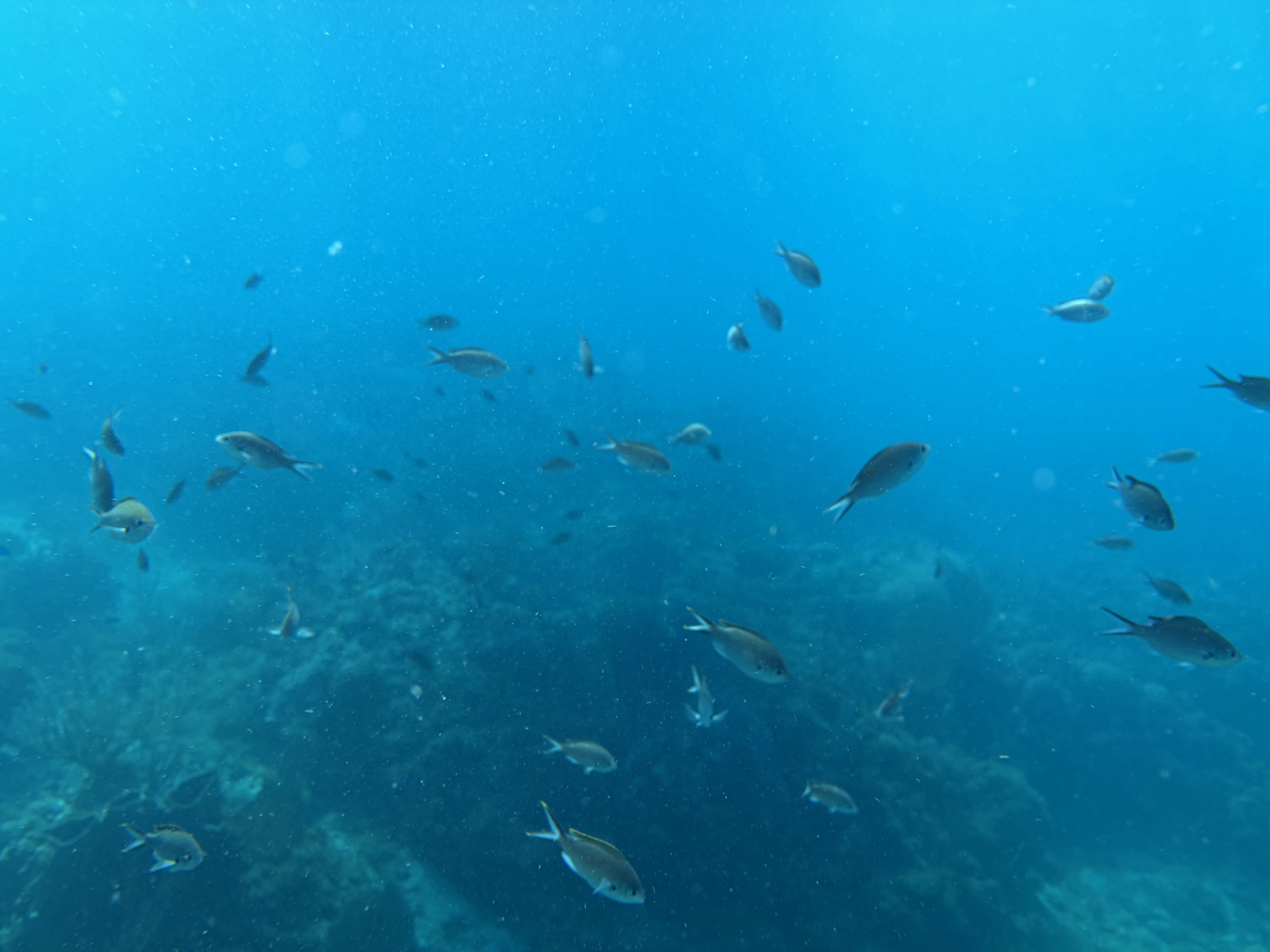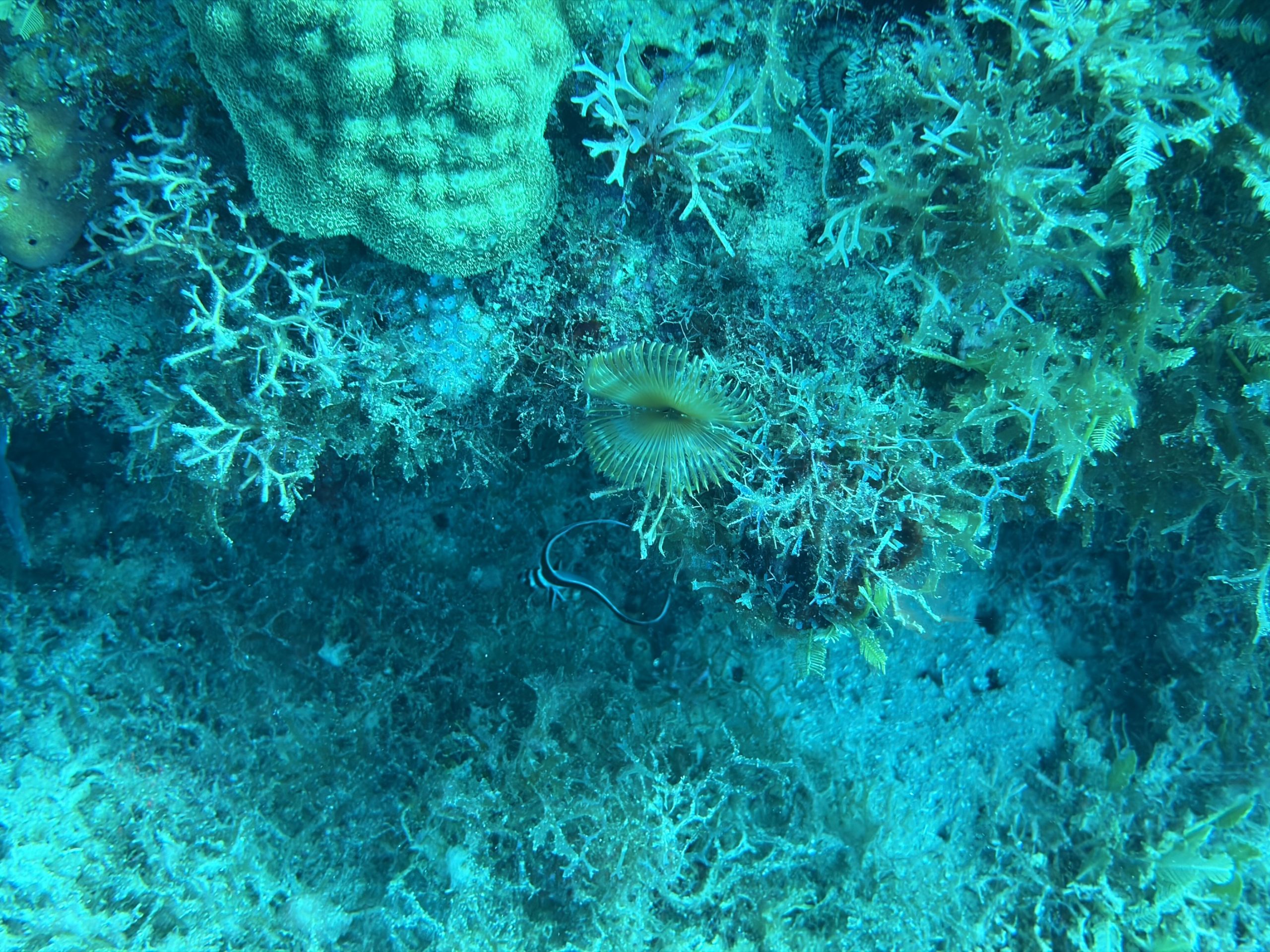 Die beiden Tauchgänge heute waren sehr entspannt. Wir haben viel gesehen, das Wasser ist durch die Sonne hell beleuchtet und klar. Schon am Morgen, aber auch während der Oberflächenpause, ist es brütend heiß, kein Lüftchen regt sich. Wir brauchen nicht einmal ein Handtuch, trotzdem sind alle entspannt. Da die anderen drei Taucher Amerikaner sind, gibt es heute kein Sprachenwirrwarr. Das heißt aber nicht, das sie besser zu verstehen sind. So richtiges American-English fordert das Ohr schon gewaltig.