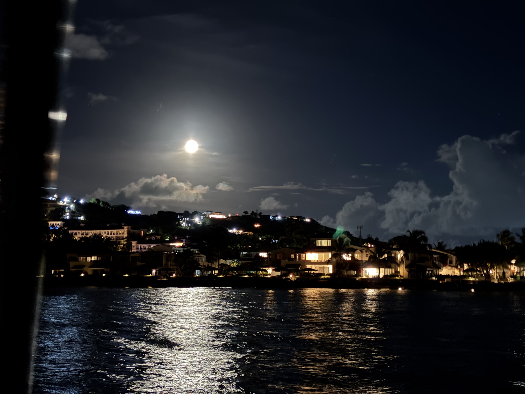 Philipp sammelt mich mit dem Dinghi am Strand wieder ein. Wir segeln langsam und gemütlich im Regen in die Dickinson Bay, weil wir noch einmal im „Salt Plage“ zu Abend essen wollen. Diesmal lässt die Brandung es zu mit dem Dinghi an den Strand neben das Restaurant zu fahren. Wir werden direkt zur Happy Hour und einem Rumpunsch aufgefordert, kaum dass wir es auf den Sand ziehen konnten. Die Happy Hour wird auf den Nachtisch geschoben, da der Einladende bereits reichlich benebelt wirkt. Wir gehen die paar Schritte ins Restaurant und hätten beinahe mal wieder unsere Sandalen vergessen und barfuß am Tisch sitzen müssen. Ist nochmal gut gegangen…